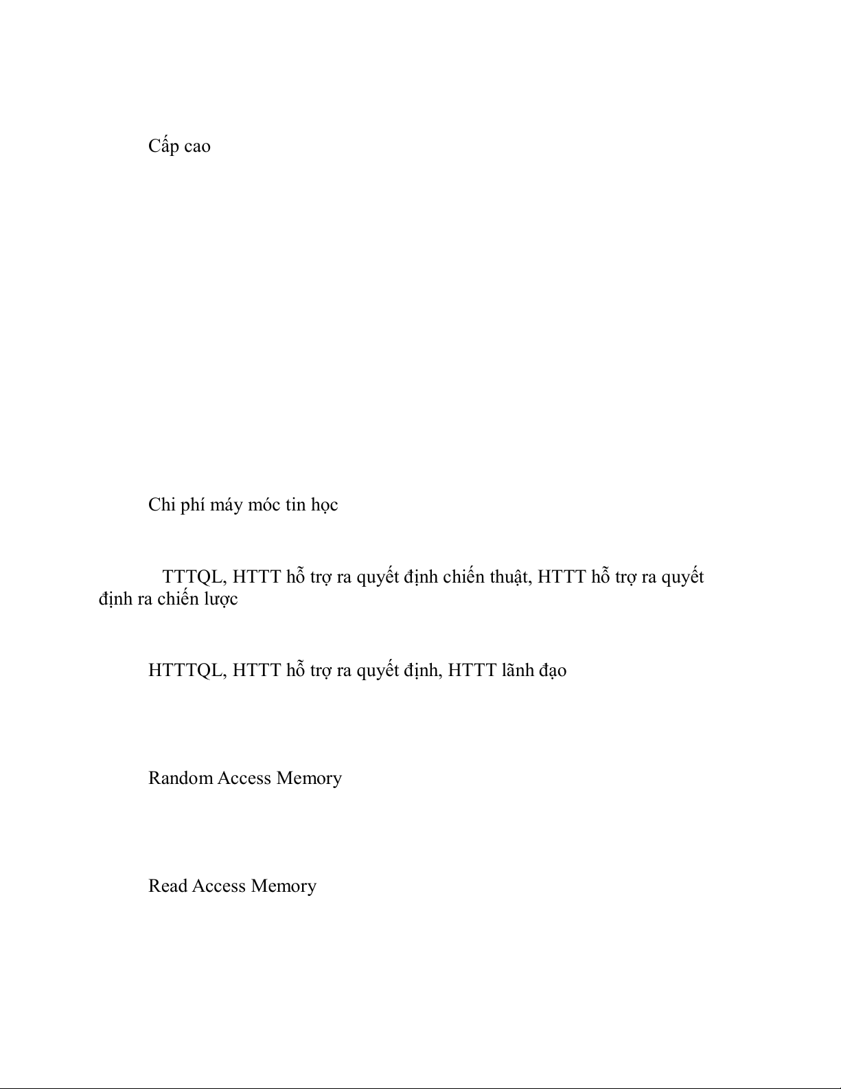 D. HTTT tin học hóa, HTTT hỗ trợ ra quyết định, HTTT lãnh đạo 9. RAM là: A. Random Access Memory B. Read And Modify C. Recent Access Memory D. Read Access Memory