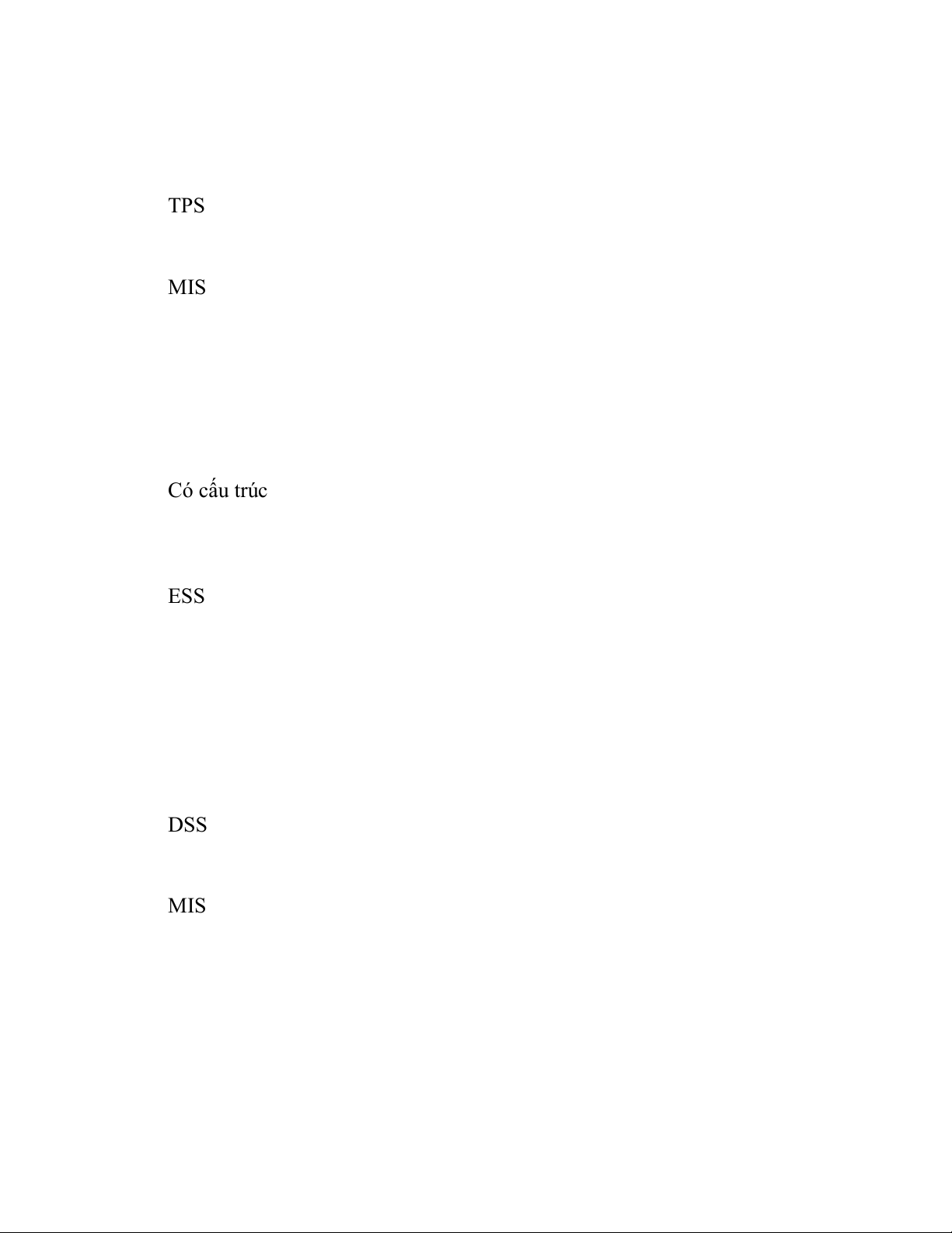 20. Hệ thống thông tin nào thường được sử dụng để lập báo cáo bán hàng? A. ESS B. TPS C. DSS D. MIS
