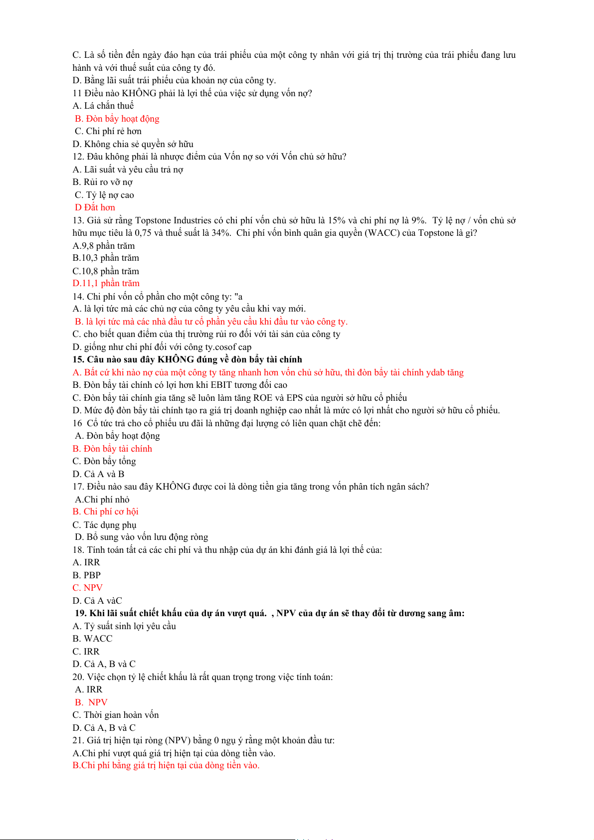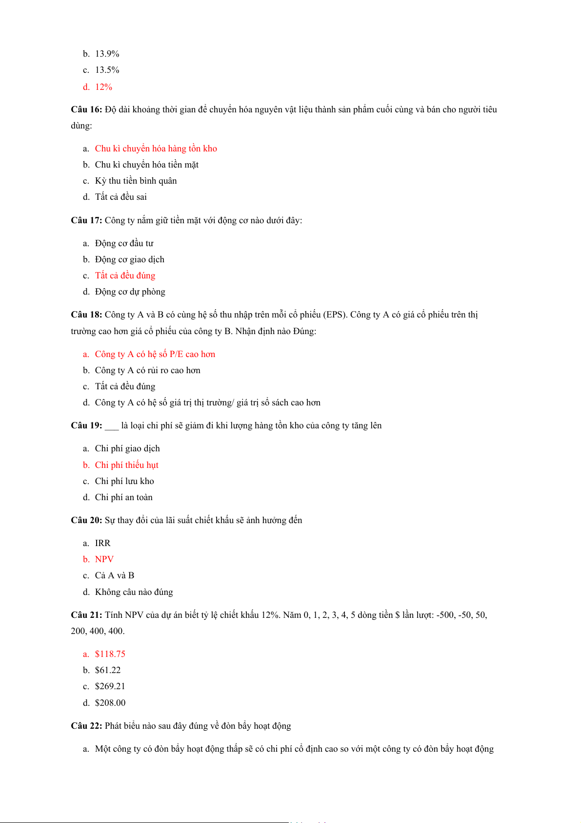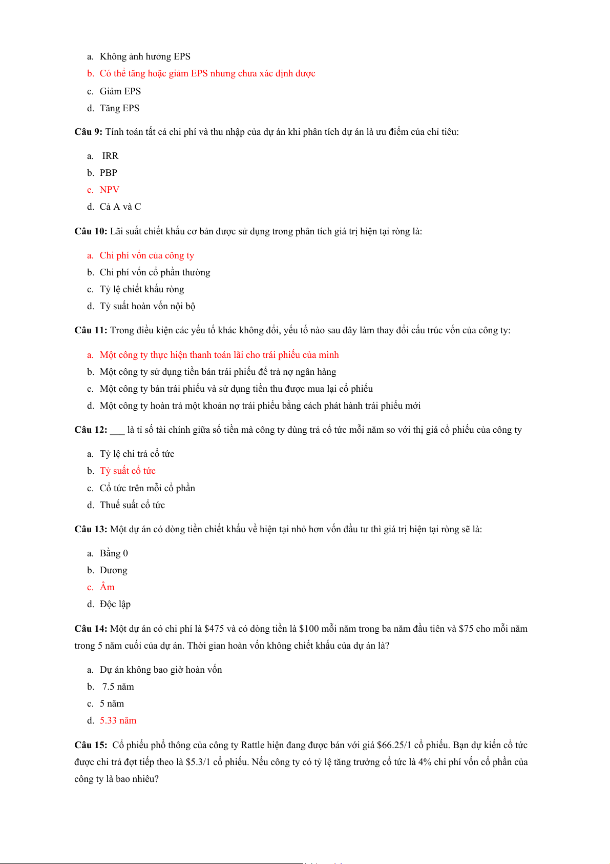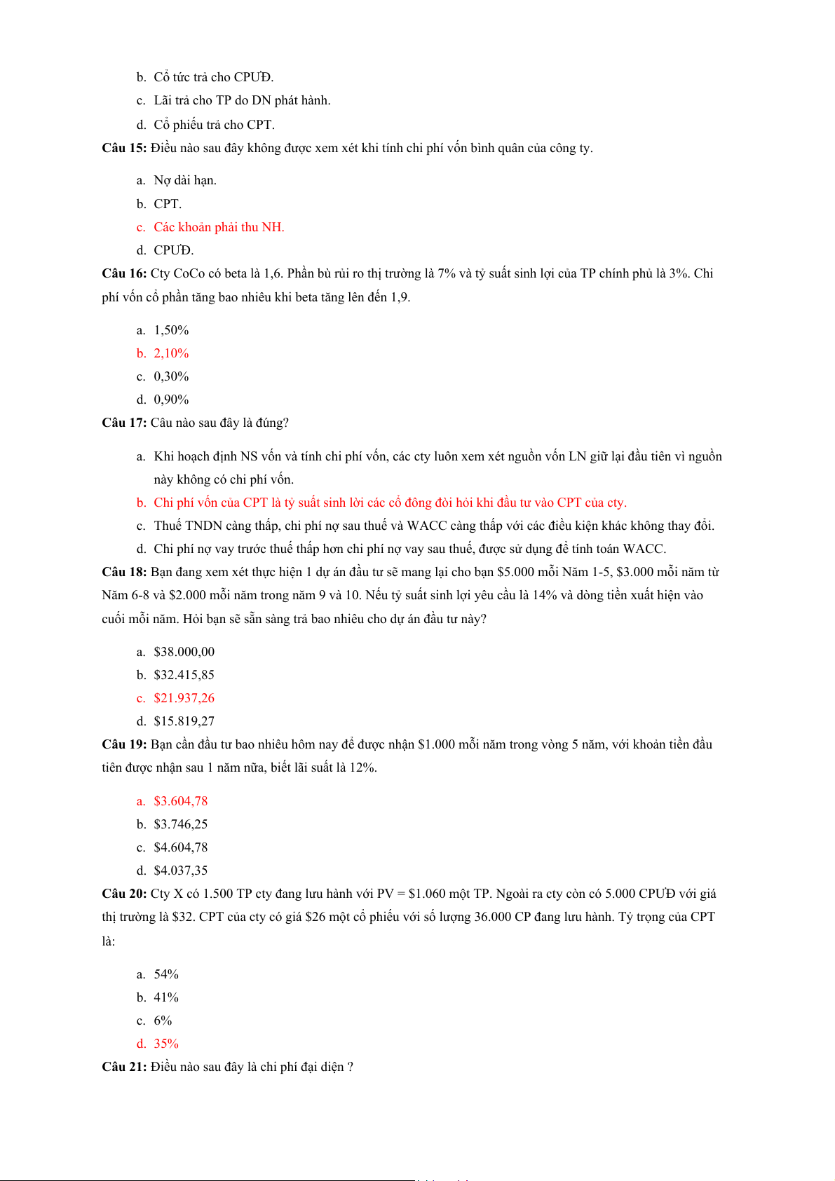 Câu 15: Điều nào sau đây không được xem xét khi tính chi phí vốn bình quân của công ty. a. Nợ dài hạn. b. CPT. c. Các khoản phải thu NH. d. CPƯĐ.