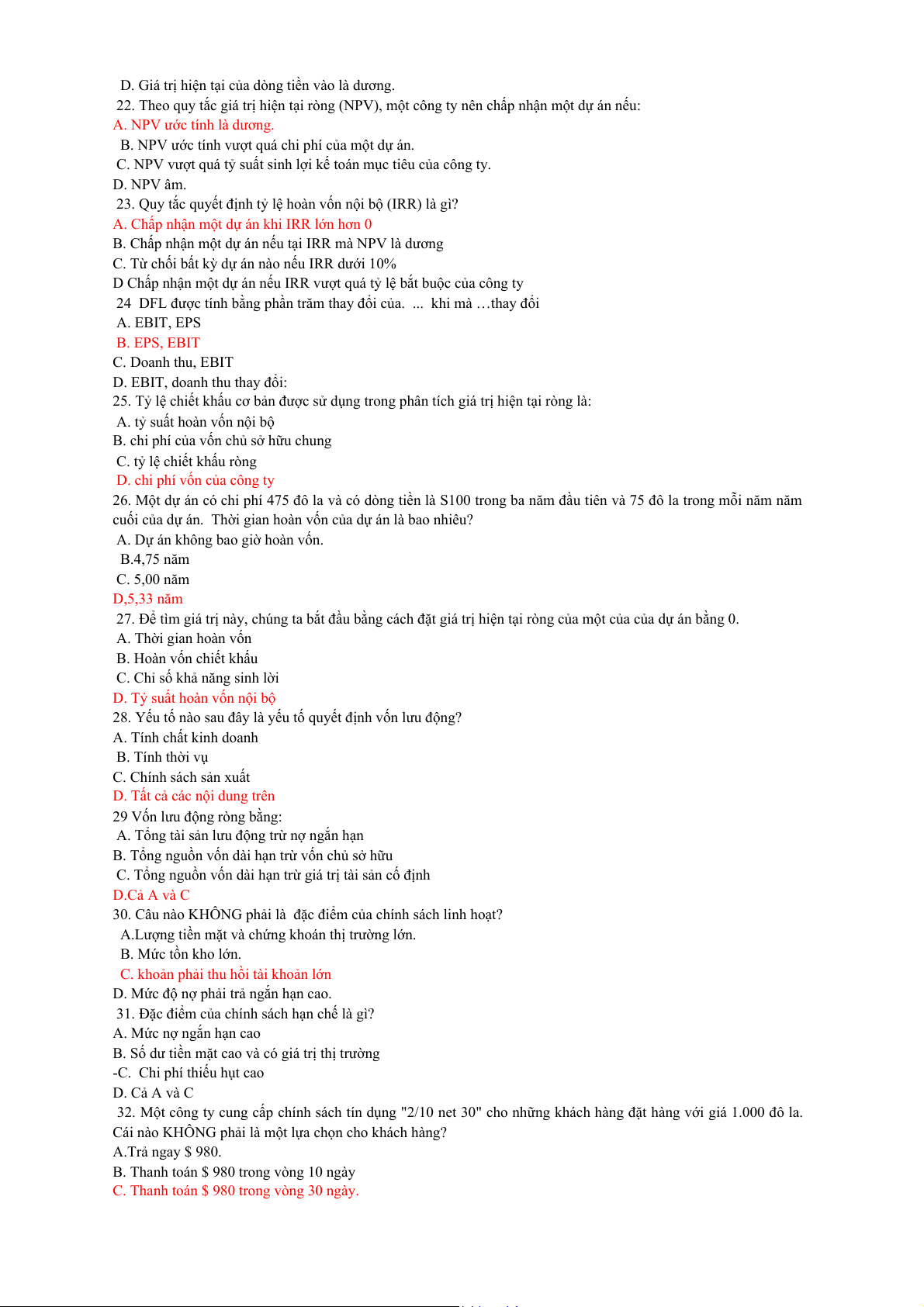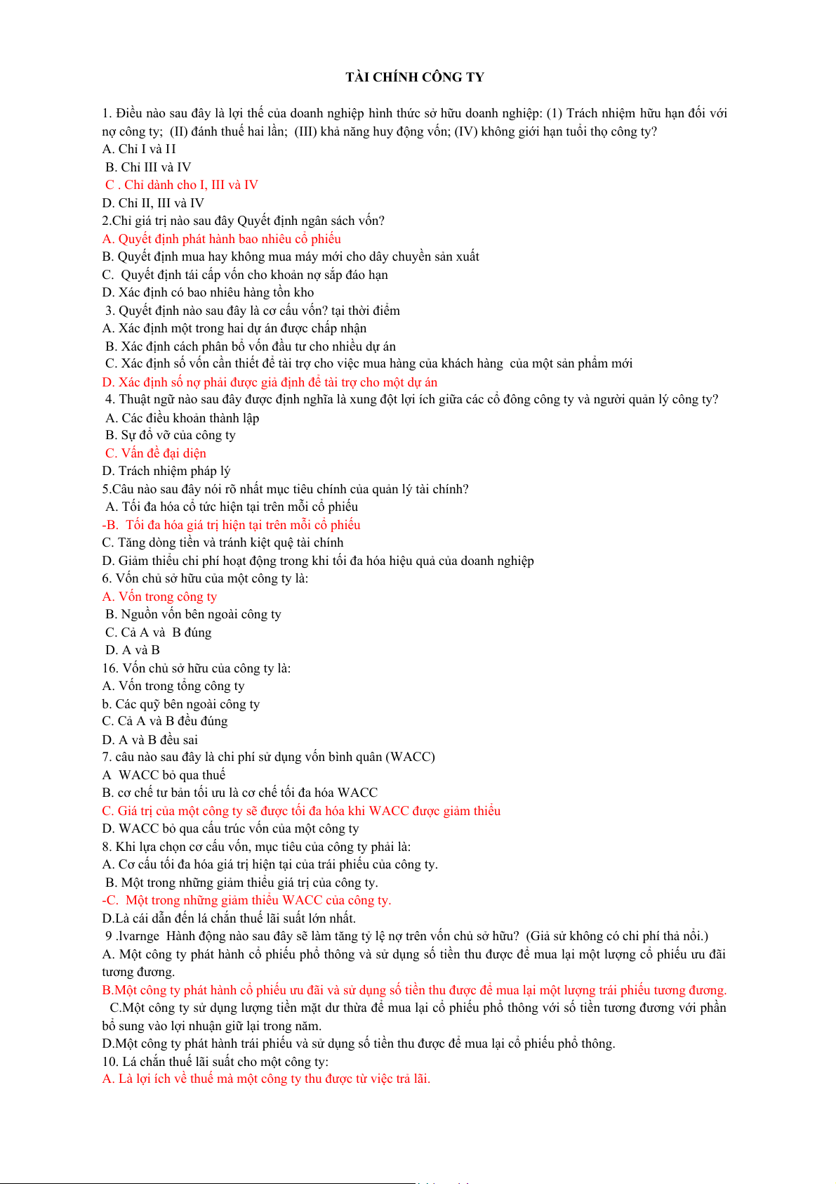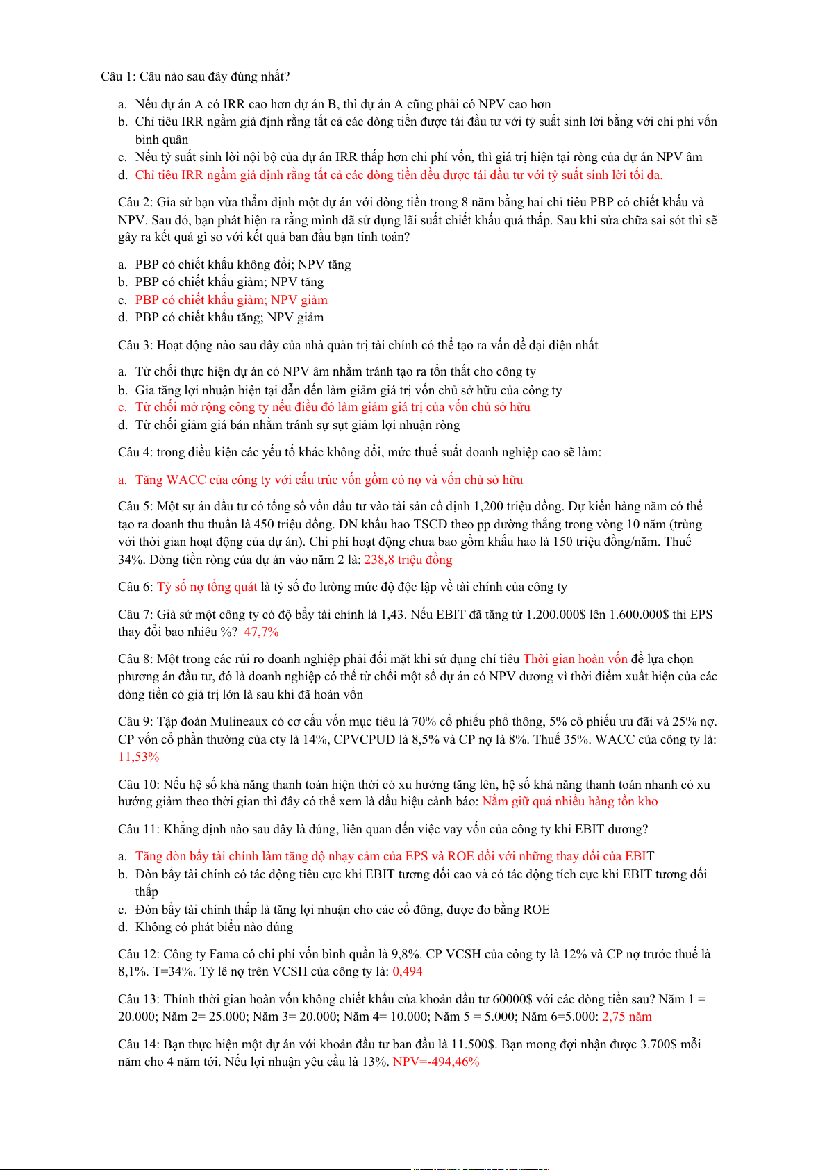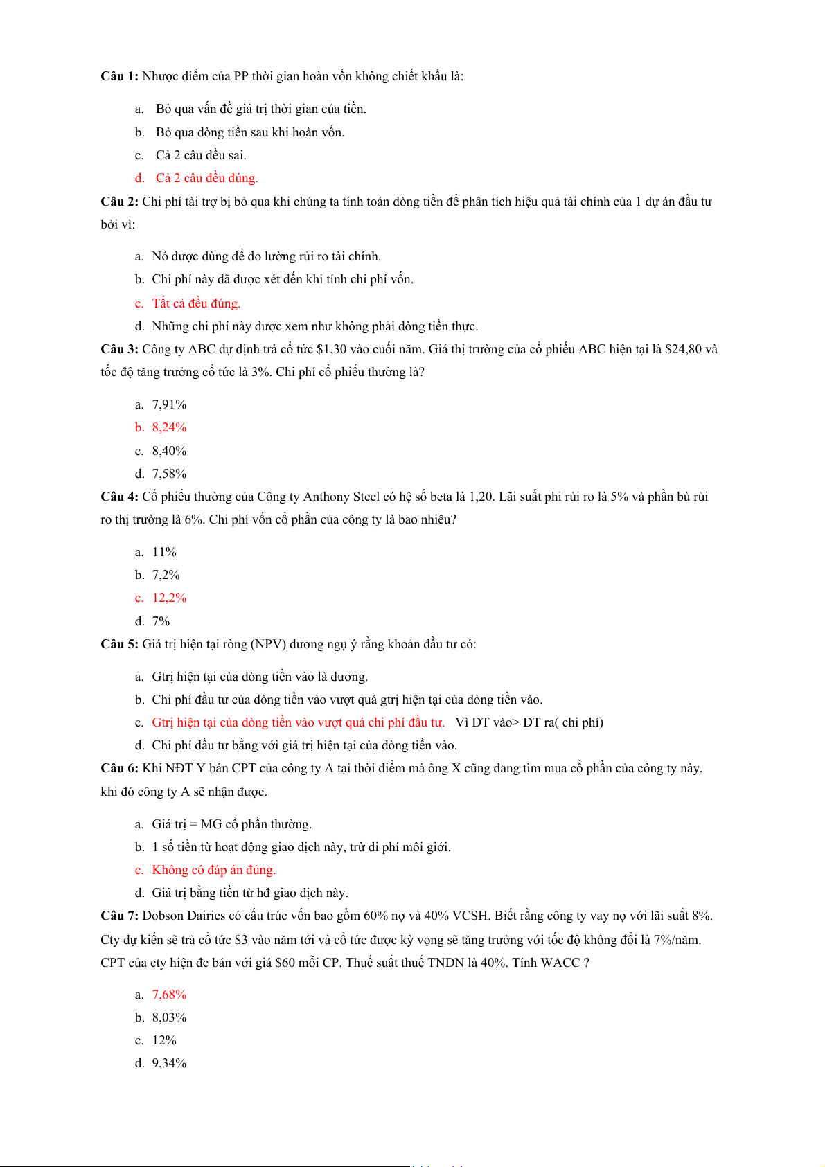 Câu 15: Điều nào sau đây không được xem xét khi tính chi phí vốn bình quân của công ty. a. Nợ dài hạn. b. CPT. c. Các khoản phải thu NH. d. CPƯĐ.