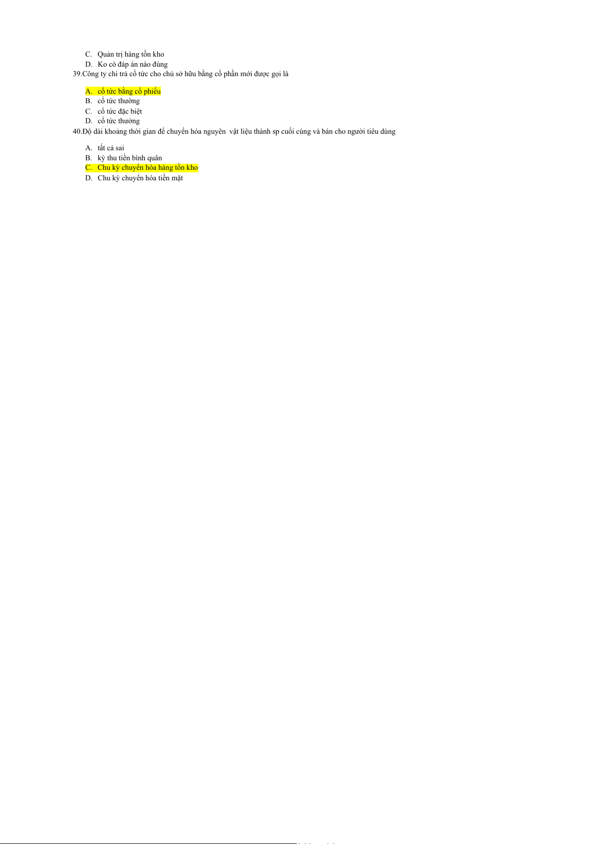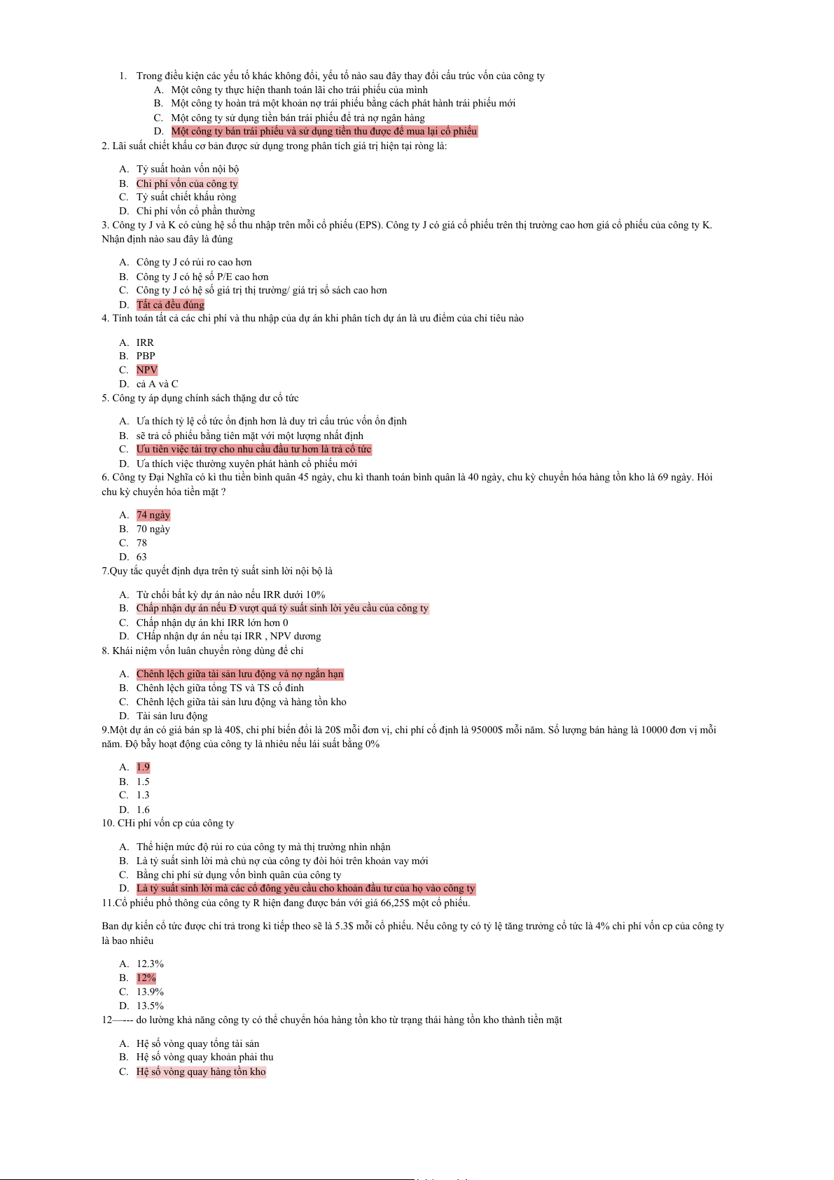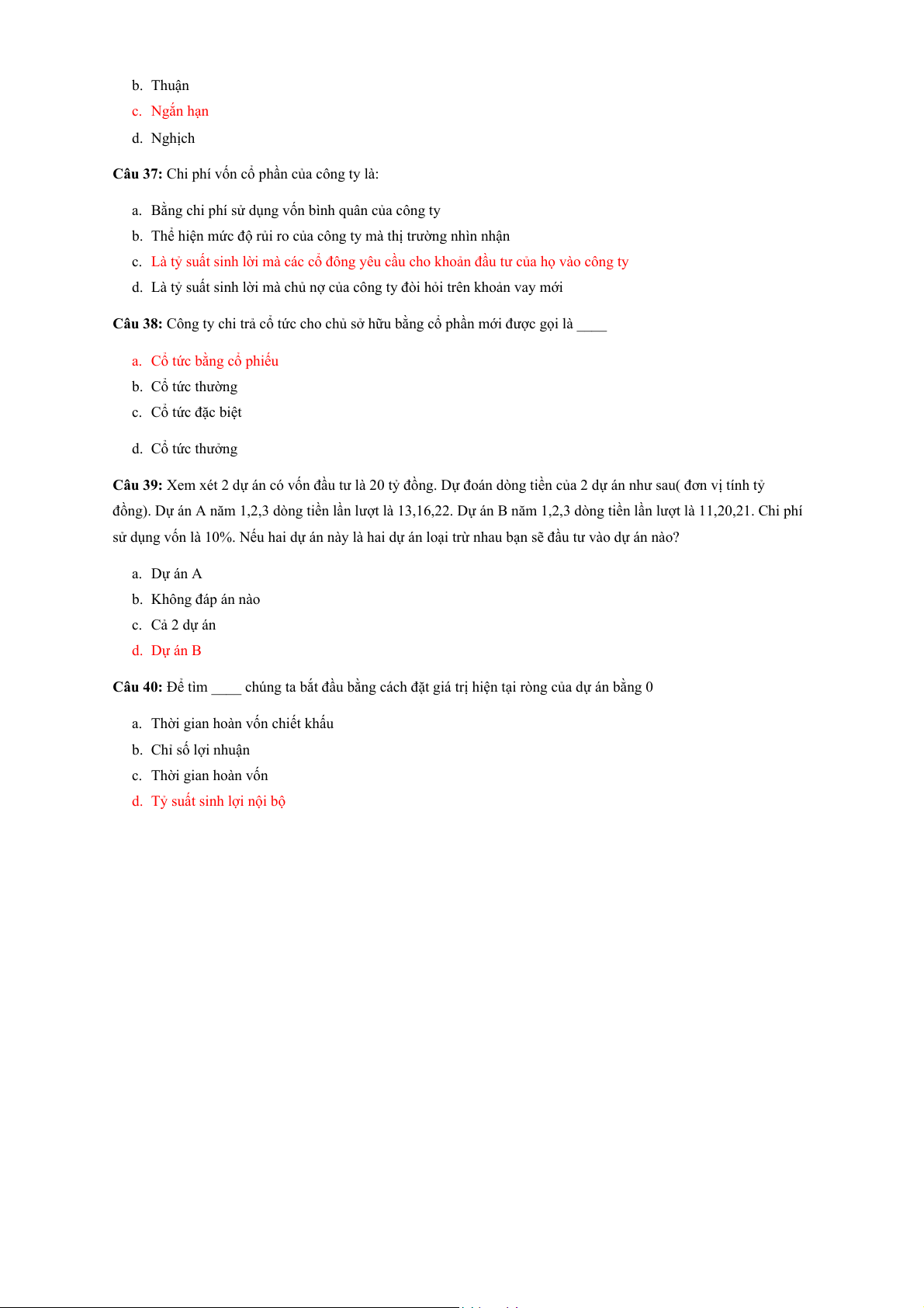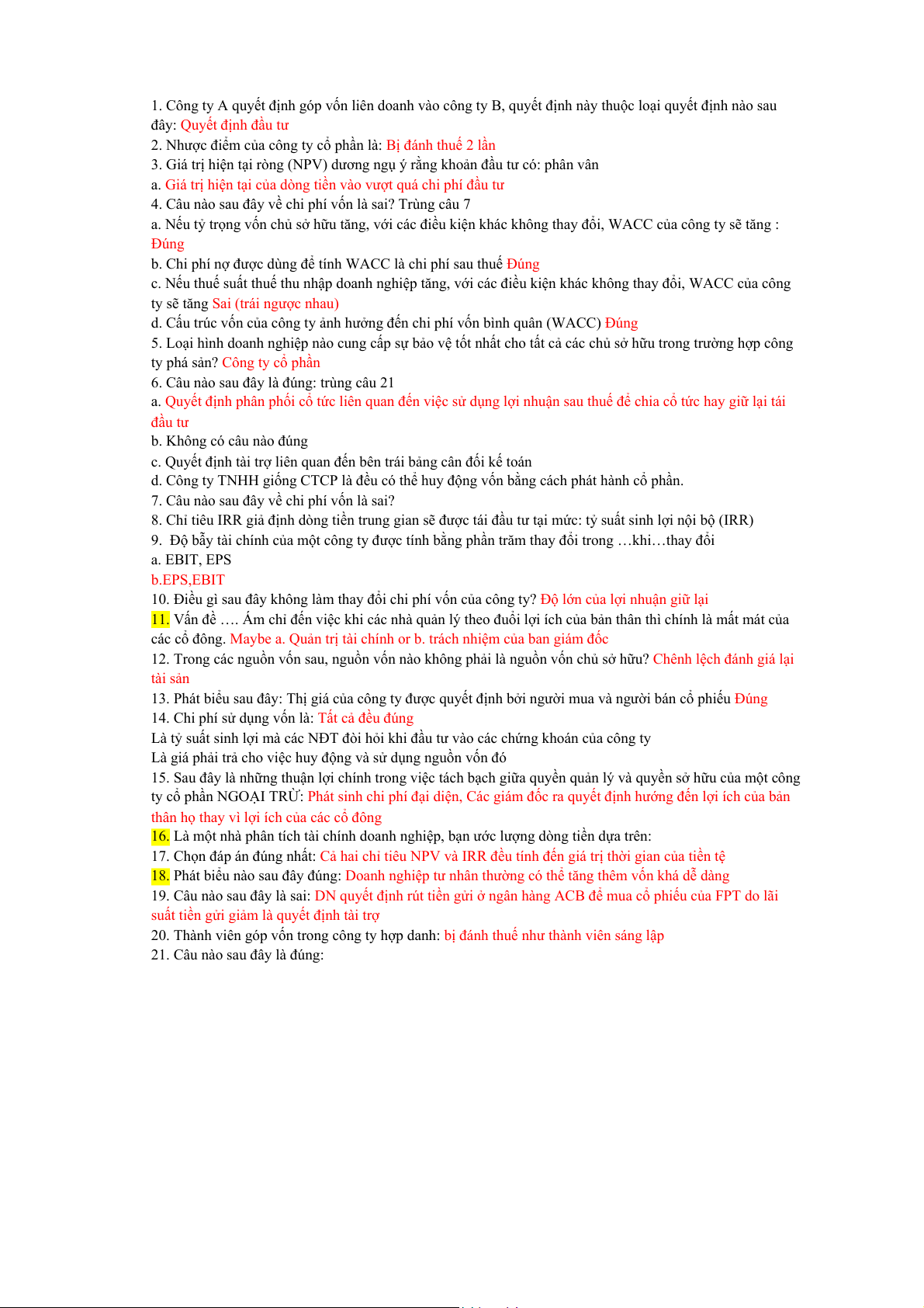 Câu 15: Điều nào sau đây không được xem xét khi tính chi phí vốn bình quân của công ty. a. Nợ dài hạn. b. CPT. c. Các khoản phải thu NH. d. CPƯĐ.