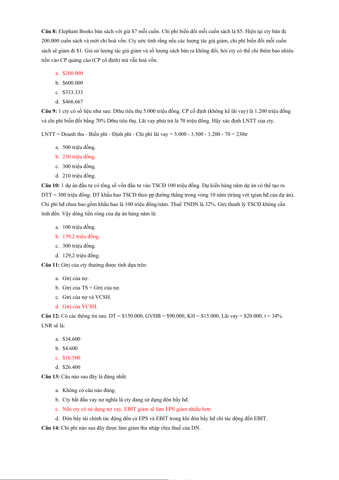 Câu 9: 1 cty có số liệu như sau: Dthu tiêu thụ 5.000 triệu đồng. CP cố định (không kể lãi vay) là 1.200 triệu đồng