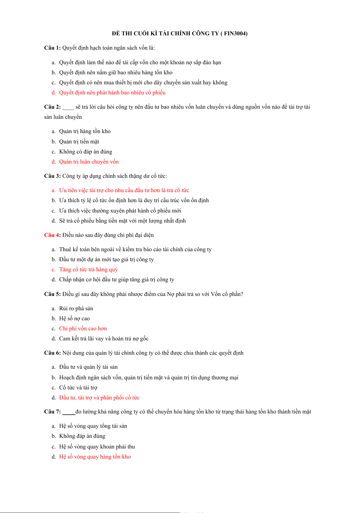 ĐỀ THI CUỐI KÌ TÀI CHÍNH CÔNG TY ( FIN3004)