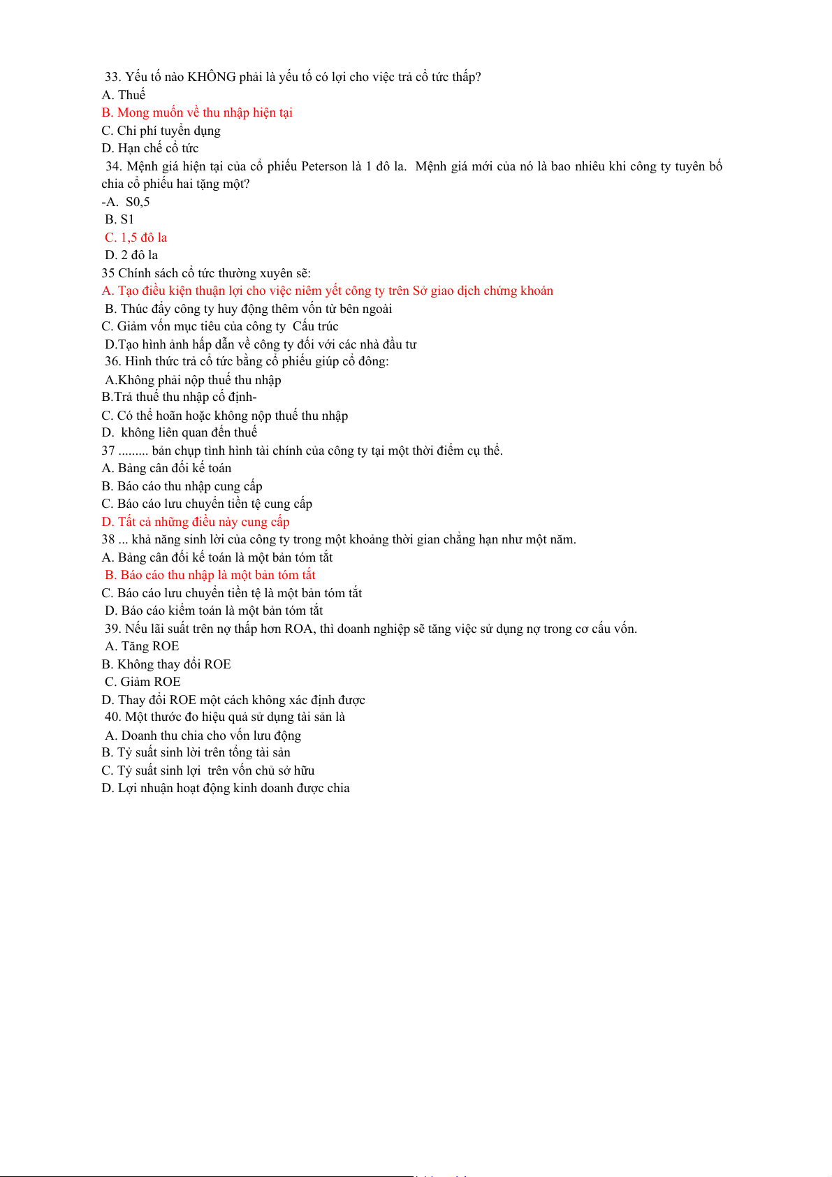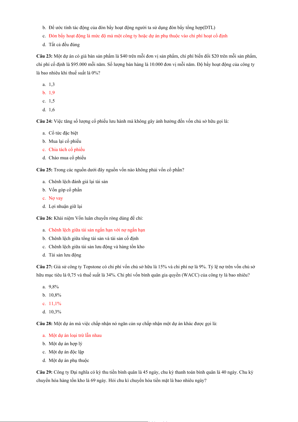 Câu 5: Điều gì sau đây không phải nhược điểm của Nợ phải trả so với Vốn cổ phần? a. Rủi ro phá sản b. Hệ số nợ cao c. Chi phí vốn cao hơn