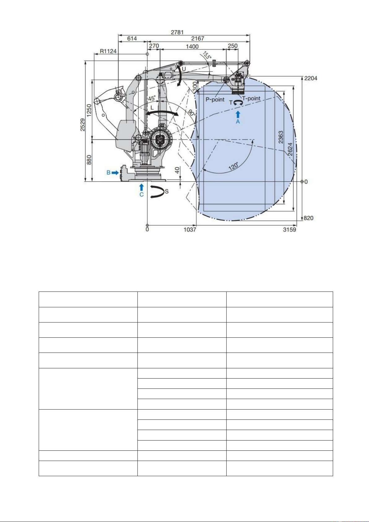 4 khớp nối theo thiều dọc Tải trọng nâng 800kg Khả năng lặp lại ±0.5mm Trục S – quay -180˚ – +180˚ Trục L – Phạm vi chuyển động cánh tay dưới -45˚ – +90˚ Trục U – cánh tay trên -120˚ – +15˚ Trục T – cổ tay -360˚ – +360˚ Trục S – quay 1.13 rad/s, 65˚/s Trục L – Tốc độ tối đa cánh tay dưới 1.13 rad/s, 65˚/s Trục U – cánh tay trên 1.13 rad/s, 65˚/s Trục T – cổ tay 2.18 rad/s, 125˚/s Quán tính cho phép Trục T – cổ tay 500kg৹m2 Khối lượng 2550kg lOMoAR cPSD| 45740413 Nhiệt độ 0˚C đến +45˚C Độ ẩm