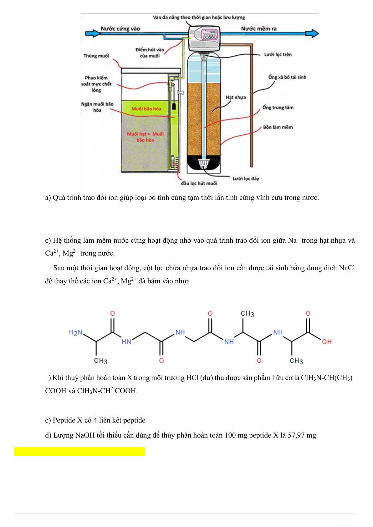 c) Hệ thống làm mềm nước cứng hoạt động nhờ vào quá trình trao đổi ion giữa Na+ trong hạt nhựa và Ca2+, Mg2+ trong nước.