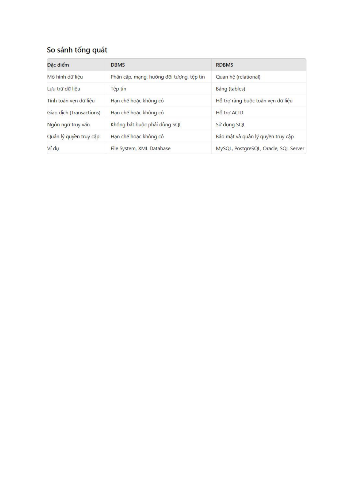 ○ Bảng (Table): Là cấu trúc cơ bản trong RDBMS, dùng để lưu trữ dữ liệu. Mỗi bảng