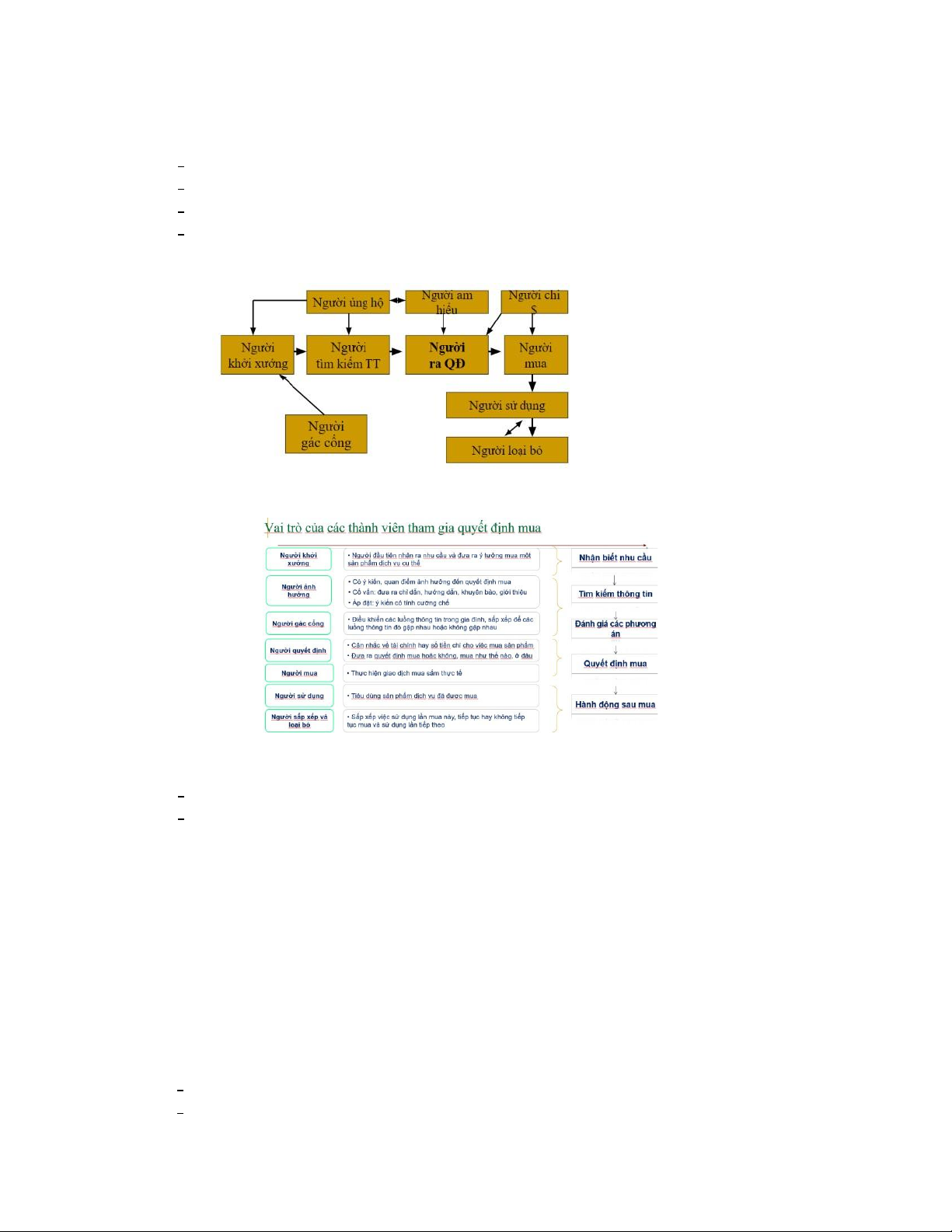 5 bước trong quá trình mua hàng của người tiêu dùng: • Nhận thức nhu cầu lOMoAR cPSD| 61207676 • Tìm kiếm thông tin • Đánh giá lựa chọn • Mua hàng • Đánh giá sau mua -