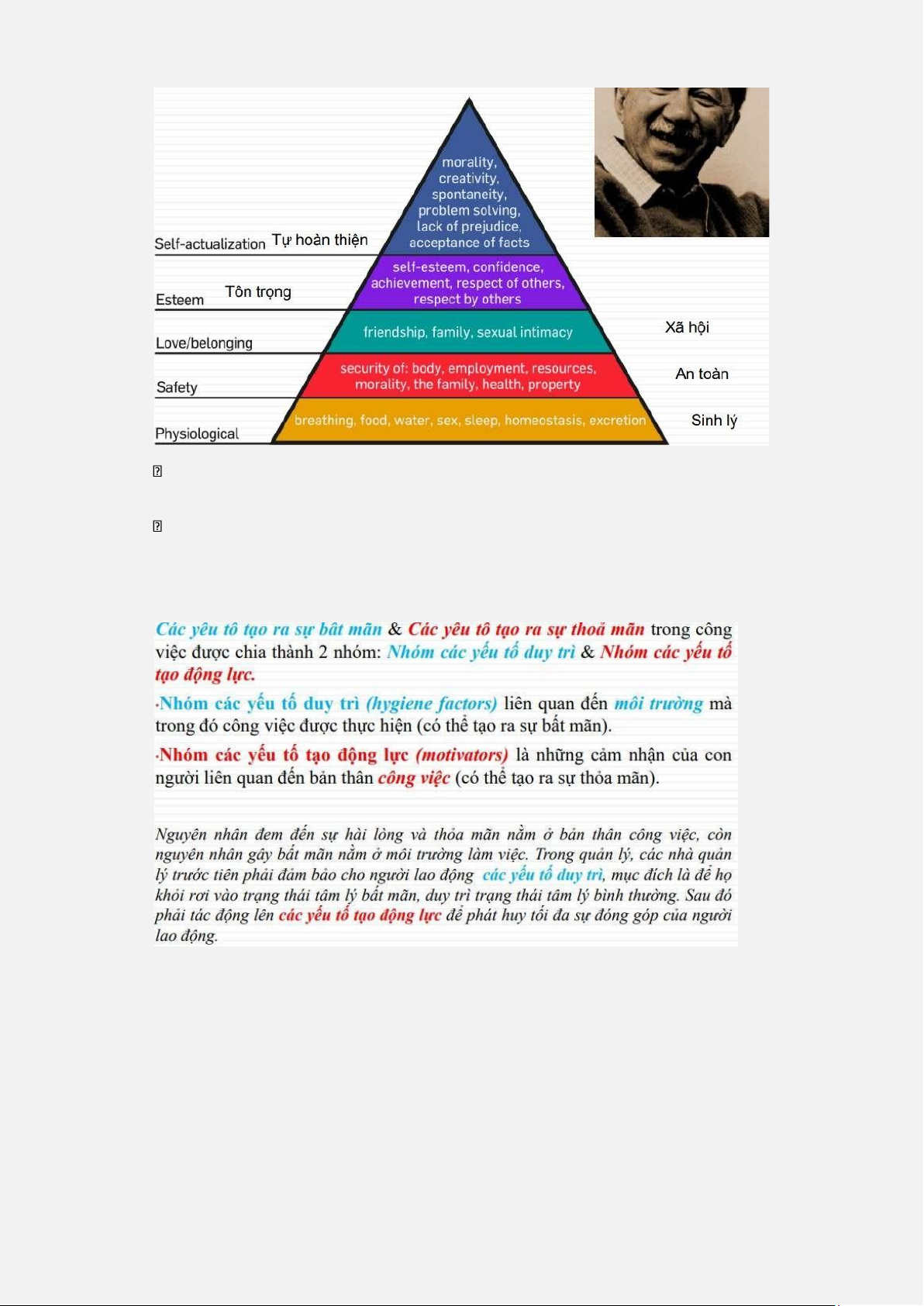 Duy trì – 3 nhóm dưới của học thuyết Abraham Maslow, còn mức thỏa mãn tạo động lực thì là 2 cấp cao nhất