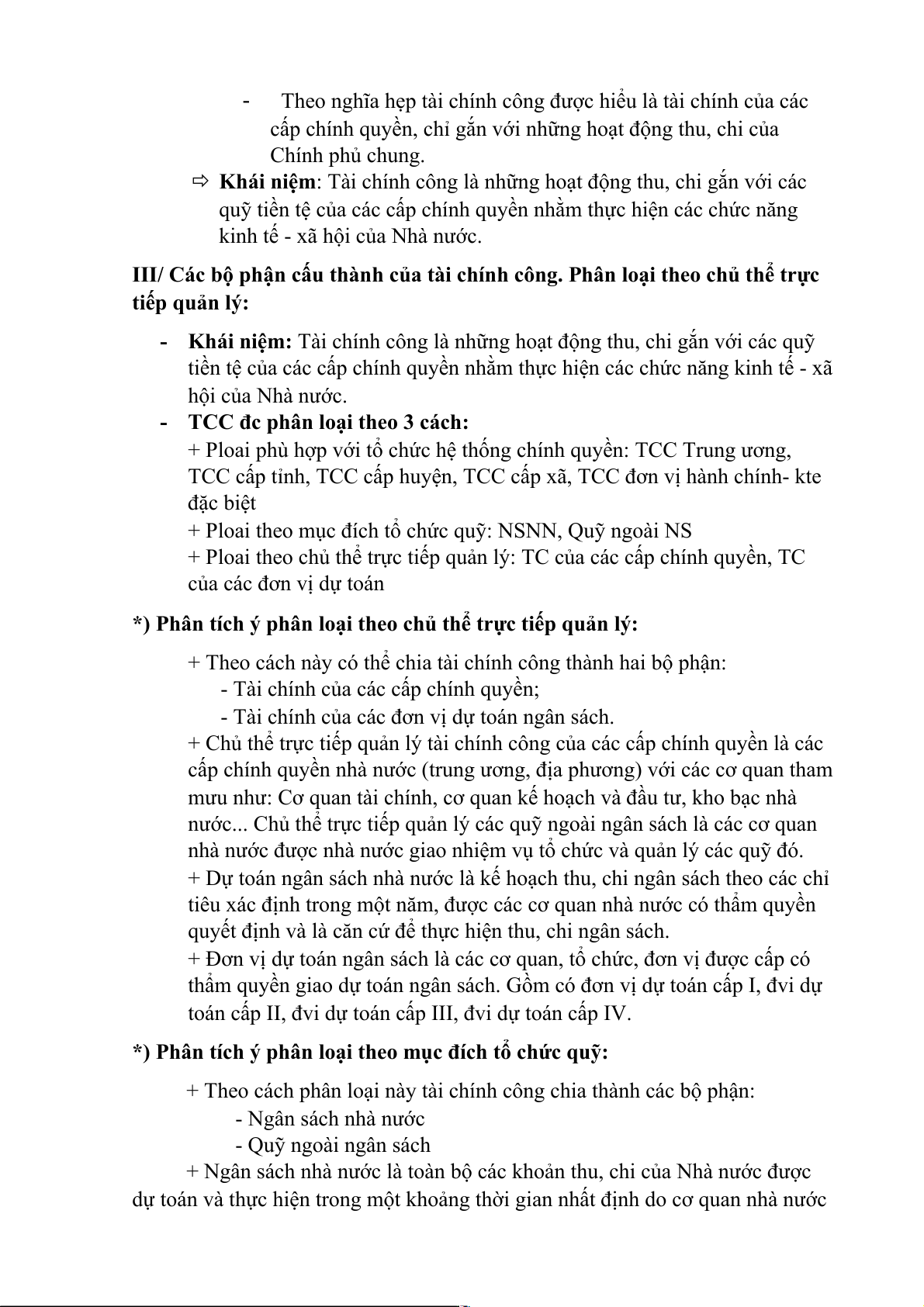III/ Các bộ phận cấu thành của tài chính công. Phân loại theo chủ thể trực tiếp quản lý: