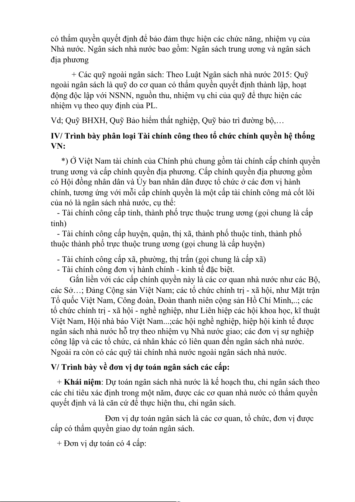 IV/ Trình bày phân loại Tài chính công theo tổ chức chính quyền hệ thống VN: