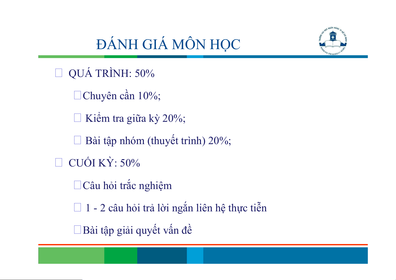 Bài tập nhóm (thuyết trình) 20%; CUỐI KỲ: 50% Câu hỏi trắc nghiệm