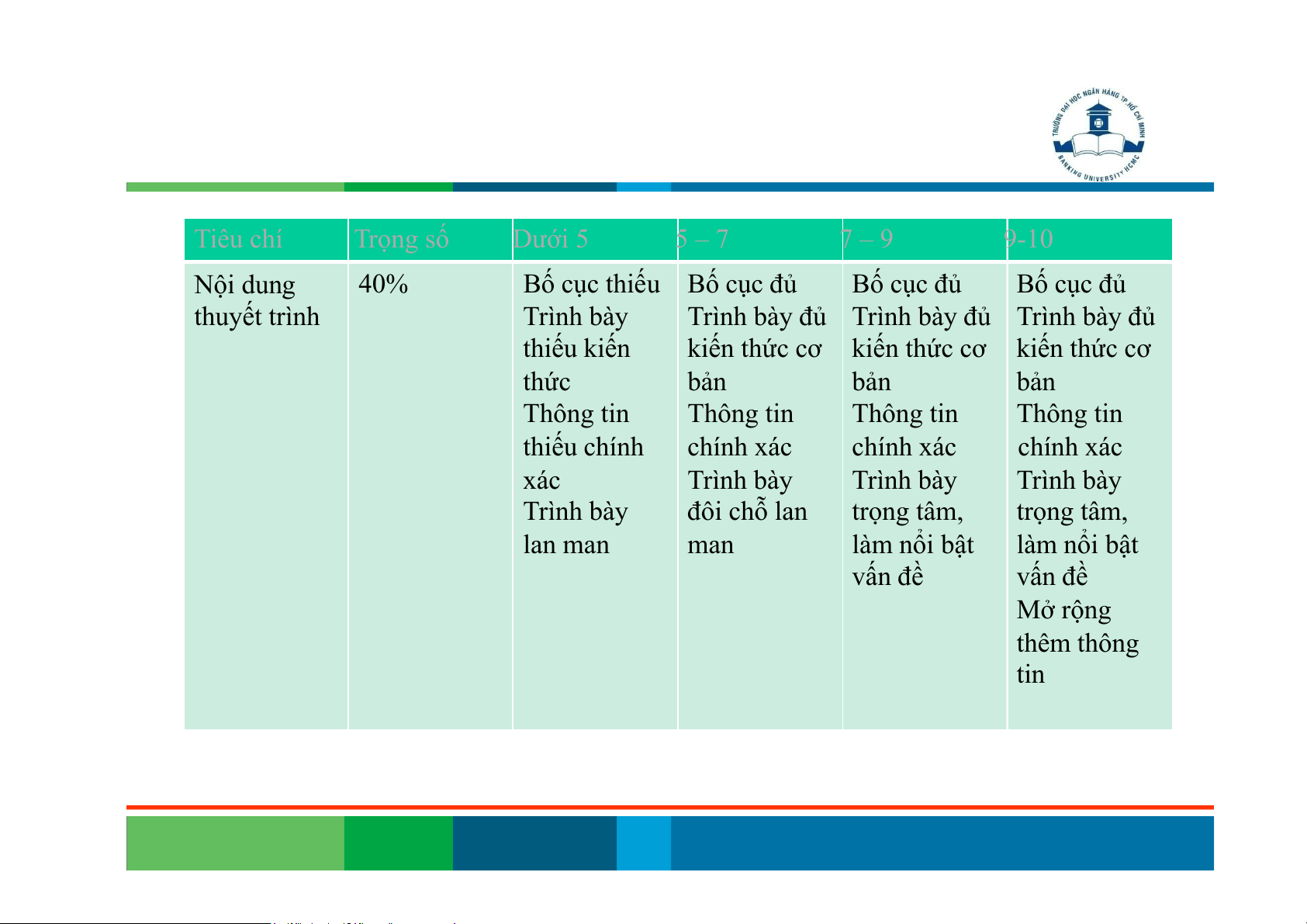 Thuyết trình/nhận xét: 40% Nội dung: 40% Trả lời câu hỏi: 20% Tiêu chí Trọng số Dưới 5 5 – 7 7 – 9 9-10 Nội dung 40%