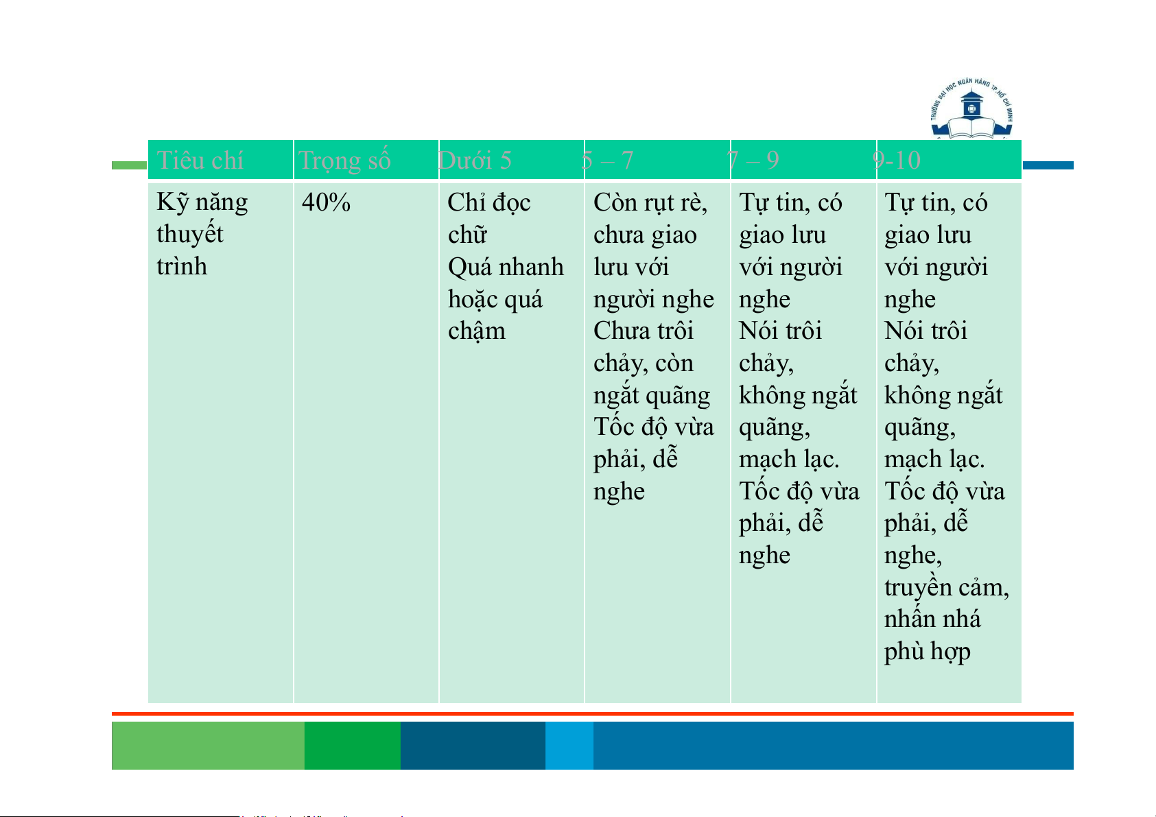kiến thức cơ kiến thức cơ thức bản bản bản Thông tin Thông tin Thông tin Thông tin thiếu chính chính xác chính xác chính xác xác Trình bày Trình bày Trình bày Trình bày đôi chỗ lan trọng tâm, trọng tâm, lan man man làm nổi bật làm nổi bật vấn đề vấn đề Mở rộng thêm thông tin Tiêu chí Trọng số Dưới 5 5 – 7 7 – 9 9-10 Kỹ năng 40% Chỉ đọc Còn rụt rè, Tự tin, có Tự tin, có thuyết chữ chưa giao giao lưu giao lưu trình Quá nhanh lưu với với người với người hoặc quá người nghe nghe nghe chậm Chưa trôi Nói trôi Nói trôi chảy, còn chảy, chảy,