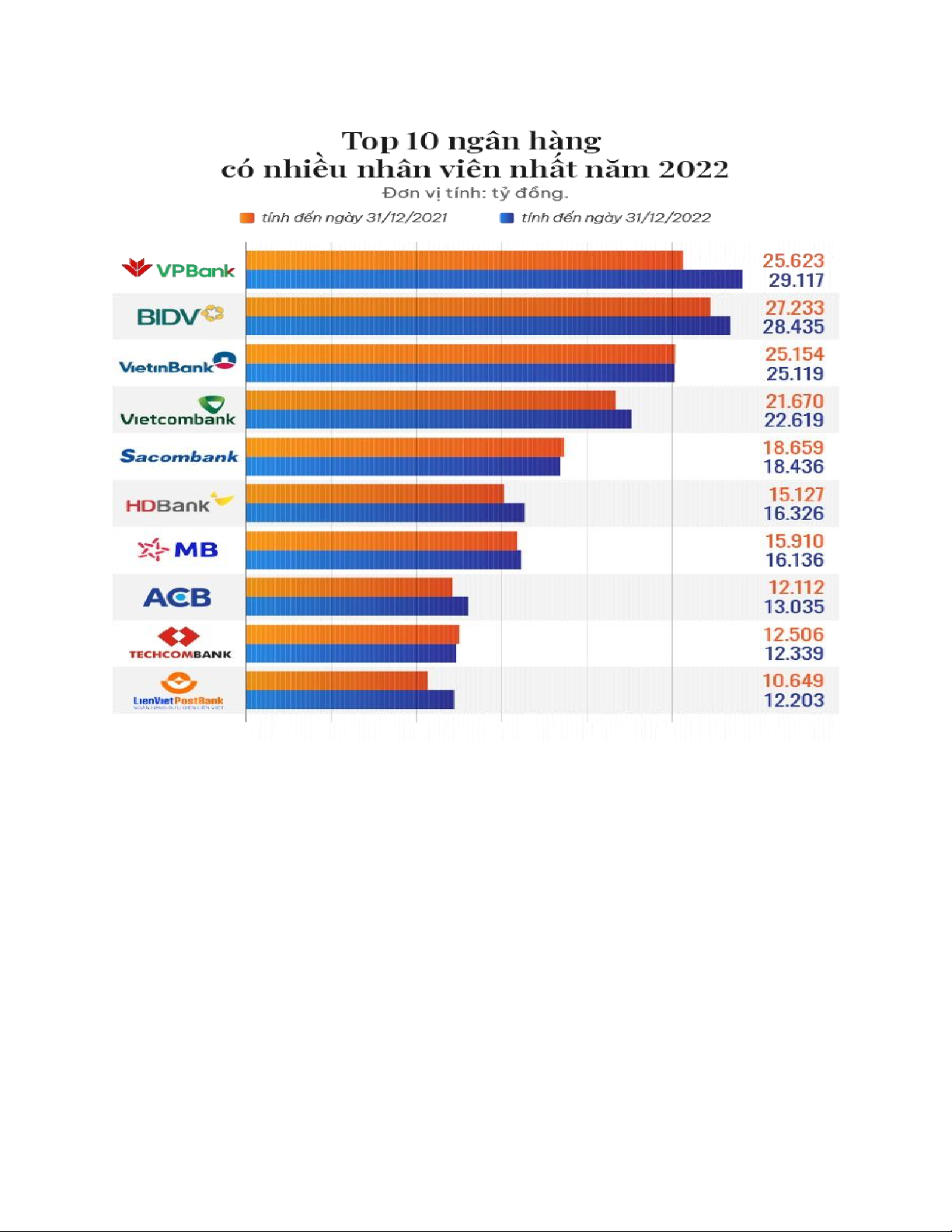 ngay sau là BIDV với số lượng nhân sự hơn 28.435 người, tăng 4,4% so với năm 2021.