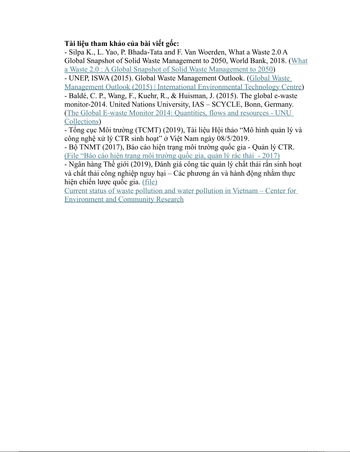 - Ngân hàng Thế giới (2019), Đánh giá công tác quản lý chất thải rắn sinh hoạt