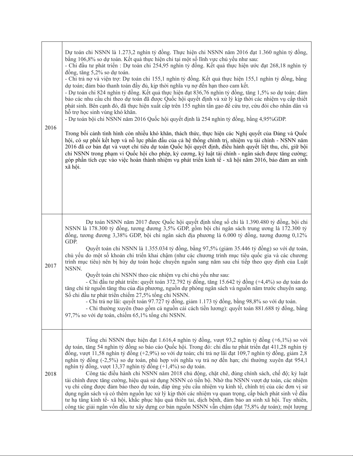 Dự toán chi NSNN là 1.273,2 nghìn tỷ đồng. Thực hiện chi NSNN năm 2016 đạt 1.360 nghìn tỷ đồng,