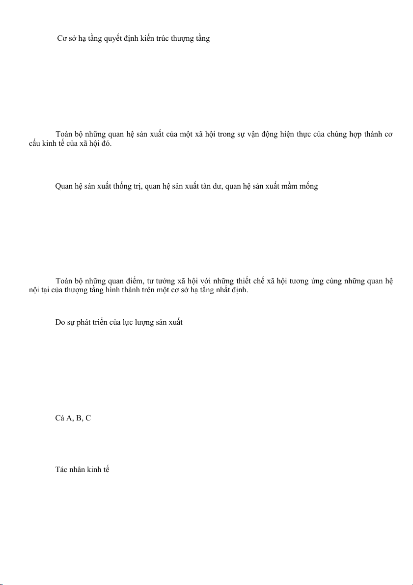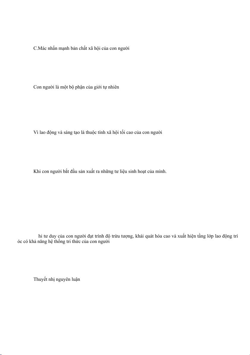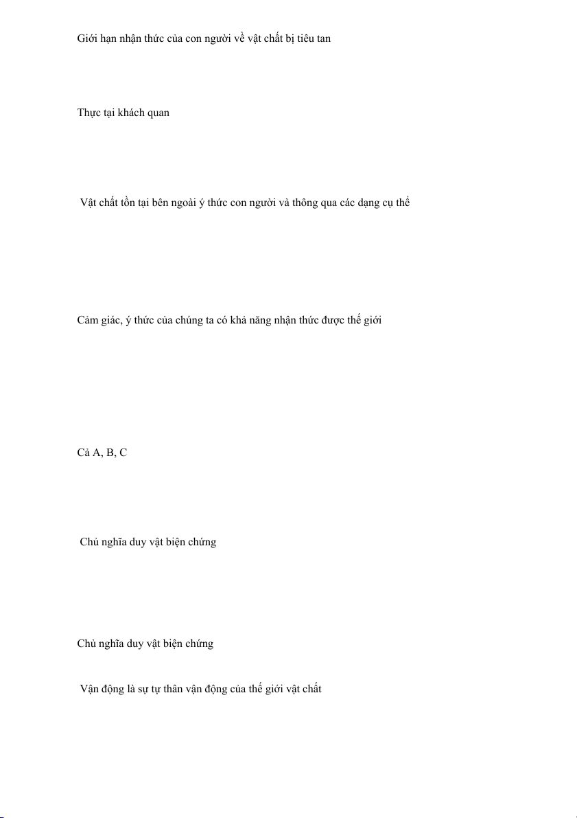 Câu 9. Con người không có khả năng nhận thức được thế giới là nội dung của học thuyết nào? A Khả tri luận B Hoài nghi luận C Bất khả tri luận D