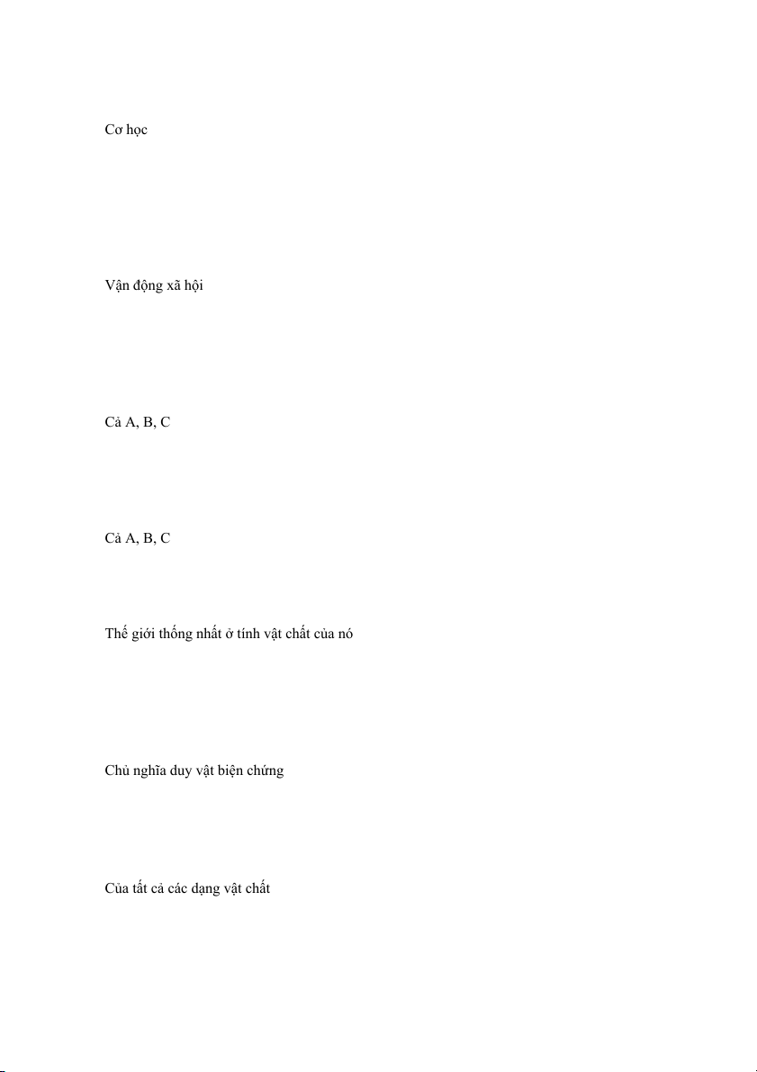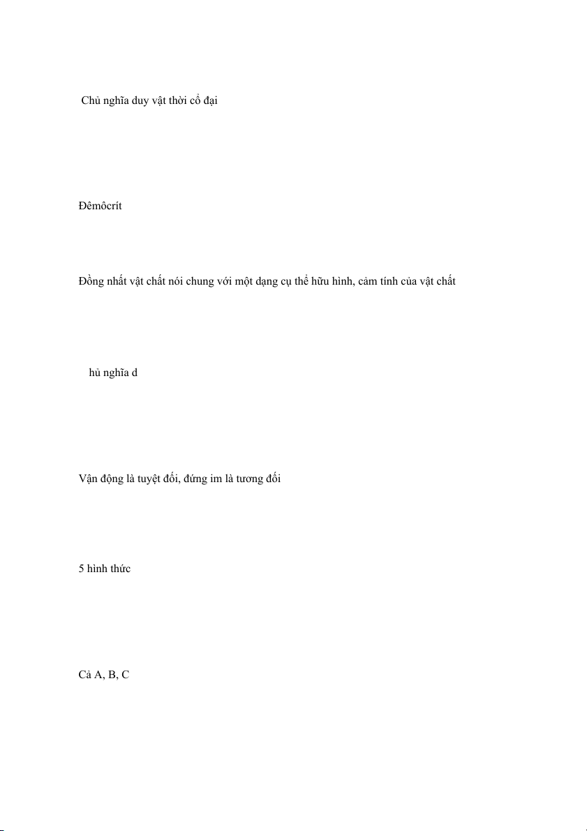 Câu 14. Quan điểm triết học nào đồng nhất vật chất với một hay một vài dạng cụ thể? A Chủ nghĩa duy tâm B