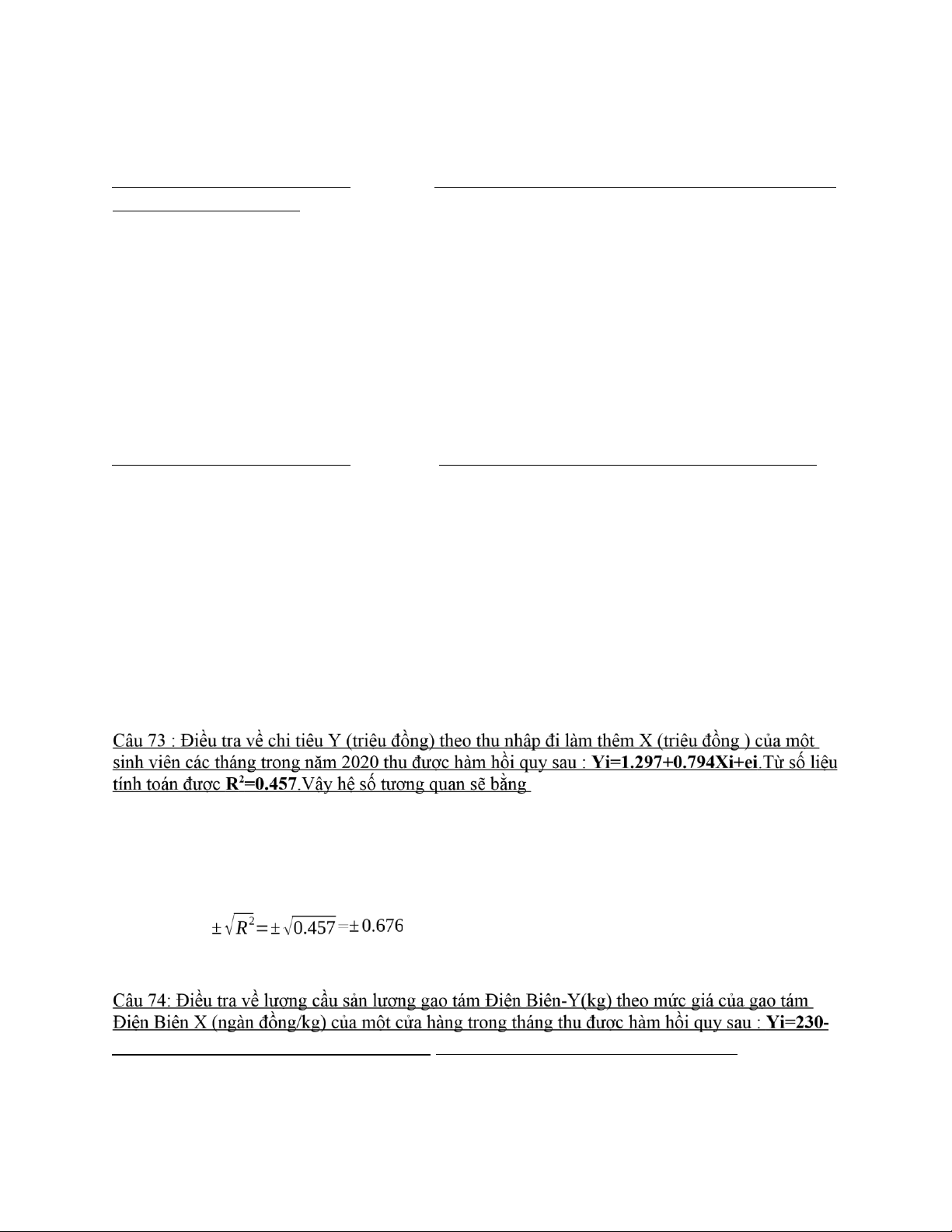 tiêu và thu nhập cùng đơn vị đo là nghìn đồng thì hàm hồi quy mới có dạng lOMoAR cPSD| 59054137 A. Yi=1297+0.794Xi +ei B. Yi=1.297+0.794Xi+ei C. Yi=1.297+794Xi +ei D. Yi=1297+794Xi +ei