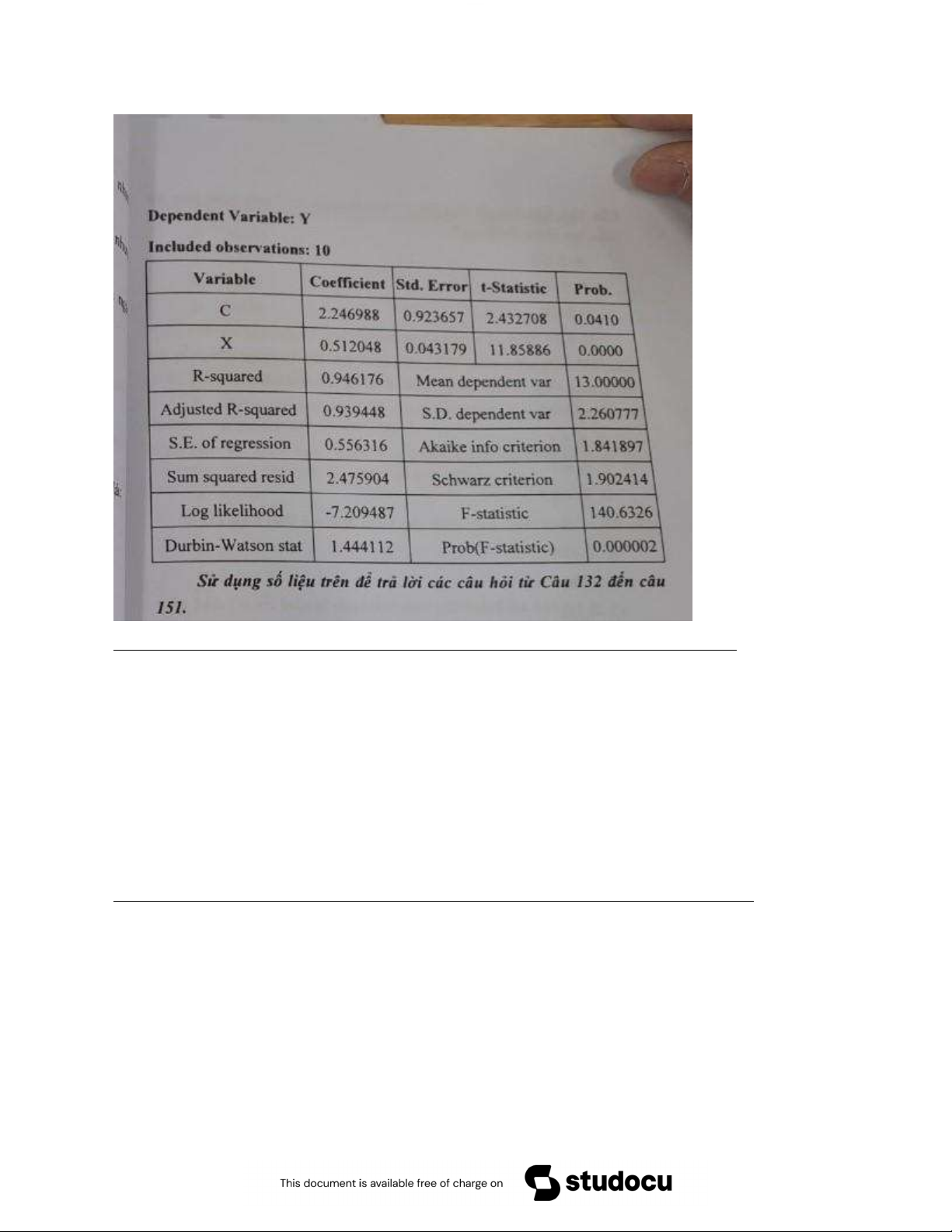 Câu 16 : Giả sử có số liệu gồm 20 quan sát về lượng cầu thịt bò (Y),giá thịt bò (X).Tiến hành hồi quy Y