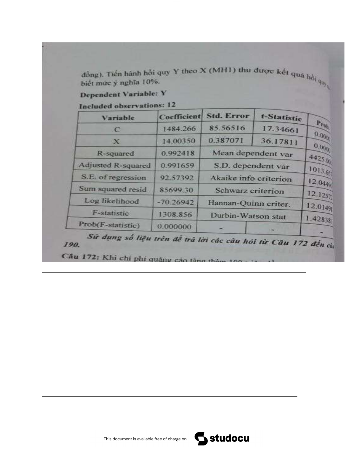 Câu 323 : Hãy viết hàm hồi quy mới khi đơn vị của doanh thu tiêu thụ và chi phí quảng cáo là ngàn đồng