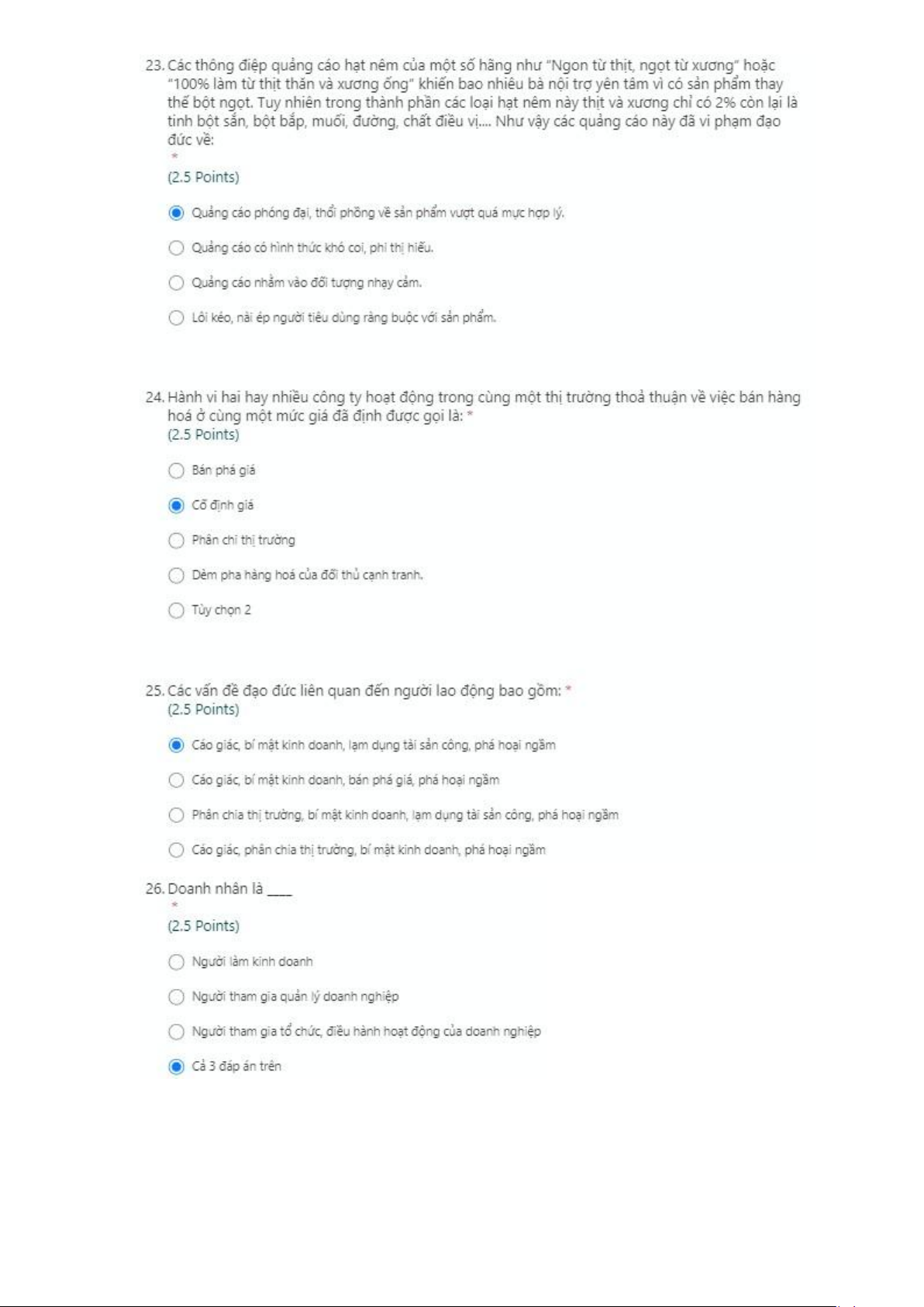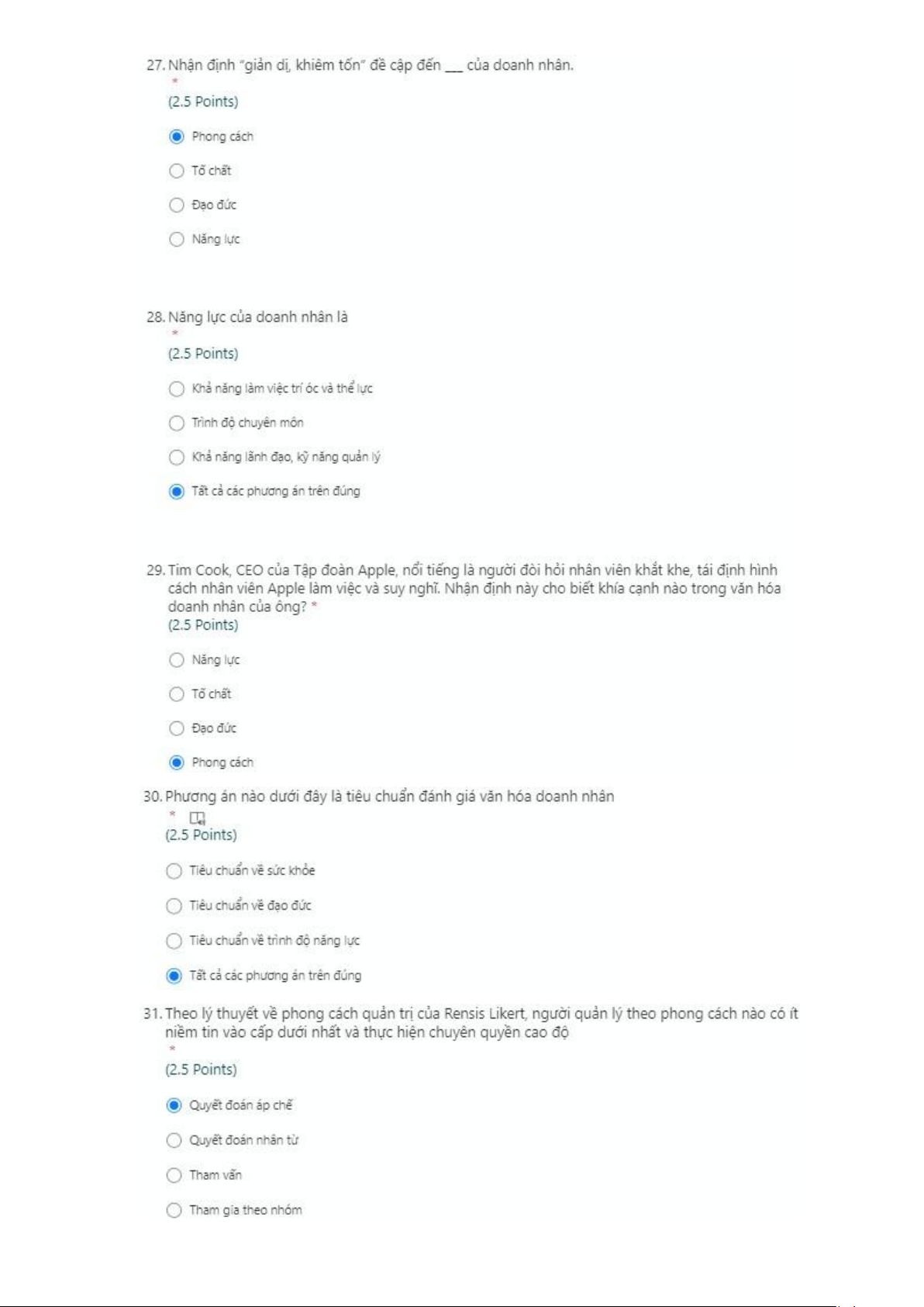 5.Các nguyên tắc và chuẩn mực của đạo đức kinh doanh không bao gồm: (0.5 Points) Tính trung thực Tôn trọng con người