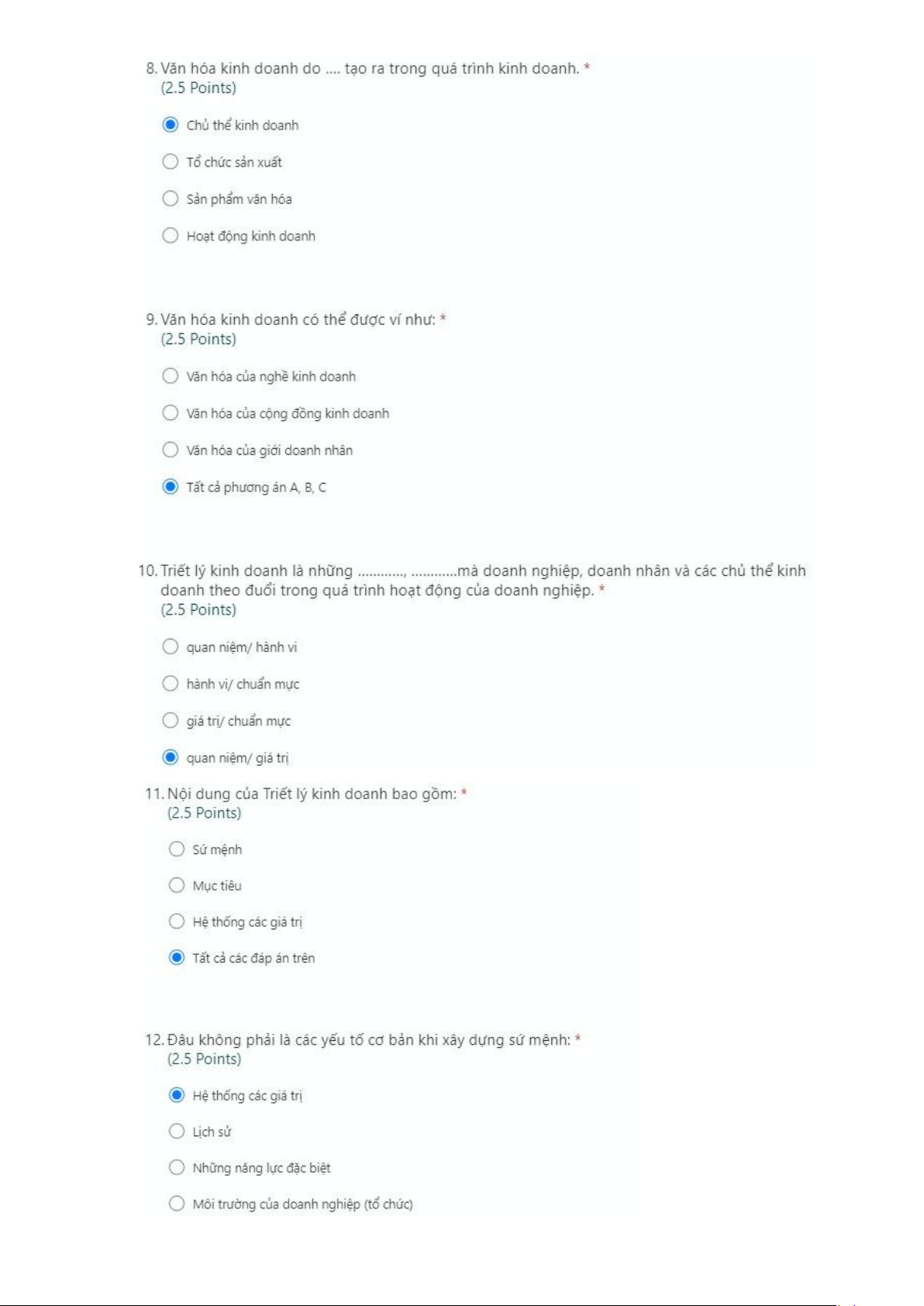 các chủ thể kinh doanh theo đuổi trong quá trình hoạt động của doanh nghiệp. (0.5 Points) quan niệm/giá trị quan niệm/hành vi hành vi/ chuẩn mực giá trị/chuẩn mực