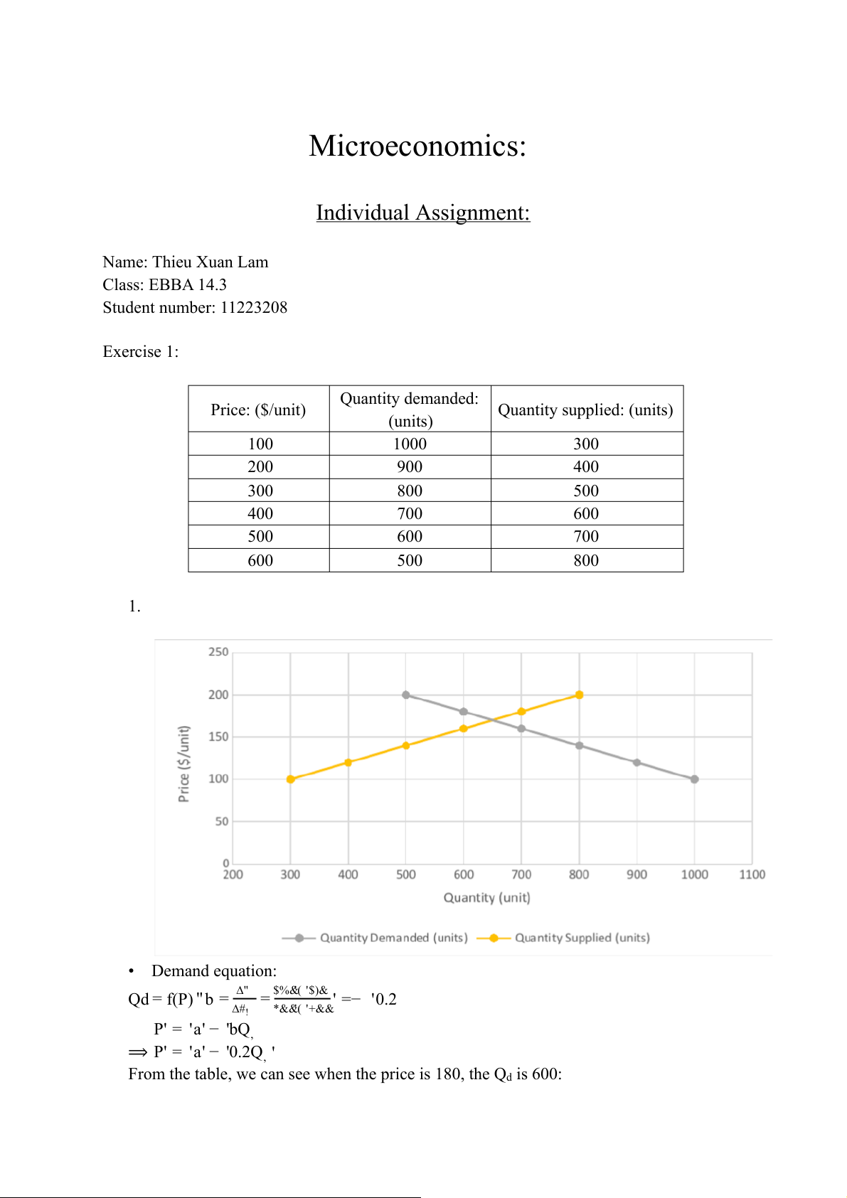 Microeconomics: Individual Assignment: Name: Thieu Xuan Lam Class: EBBA 14.3 Student number: 11223208 Exercise 1: Quantity demanded: Price: ($/unit) Quantity supplied: (units) (units) 100 1000 300 200 900 400 300 800 500 400 700 600 500 600 700 600 500 800 1. • Demand equation: