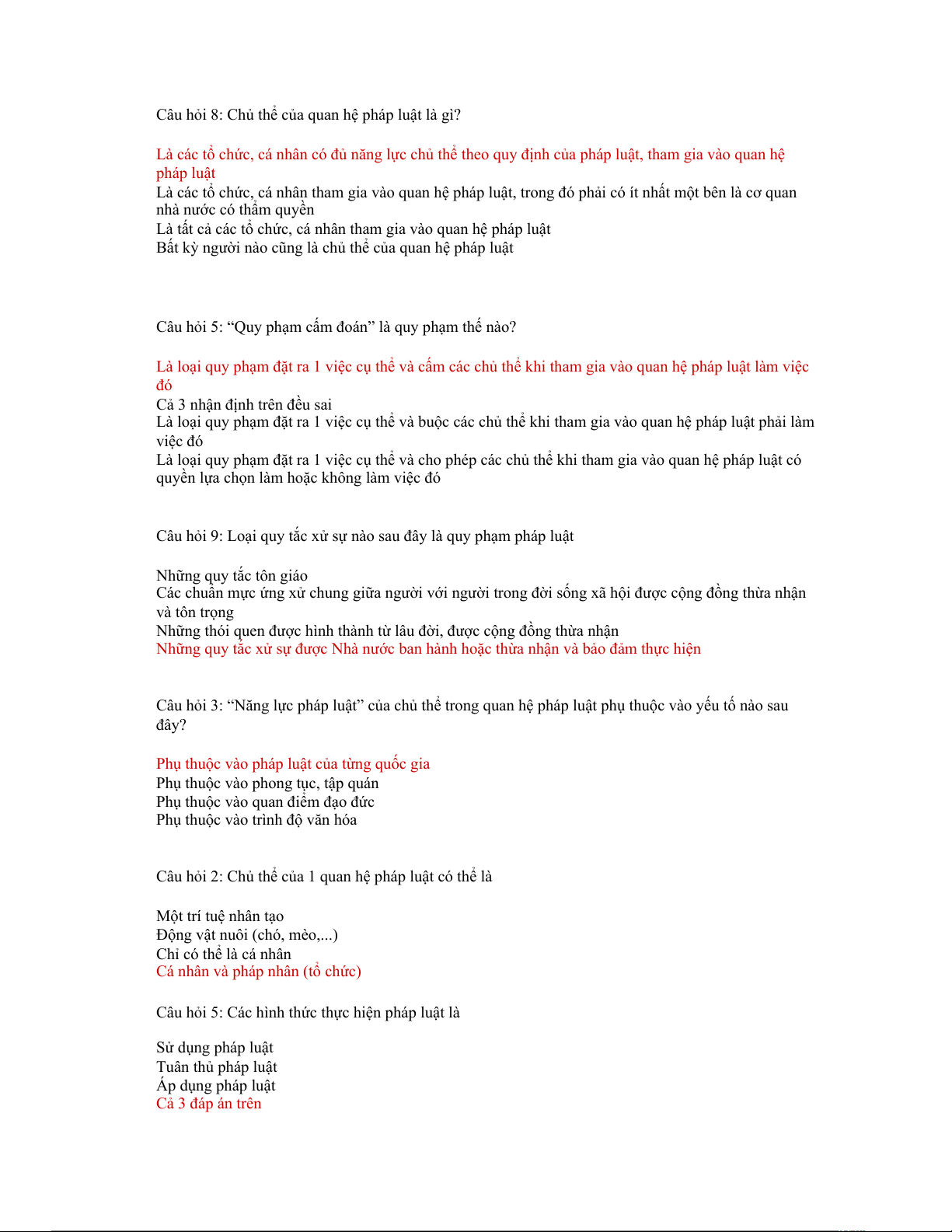 Câu hỏi 5: Các hình thức thực hiện pháp luật là Sử dụng pháp luật Tuân thủ pháp luật Áp dụng pháp luật Cả 3 đáp án trên