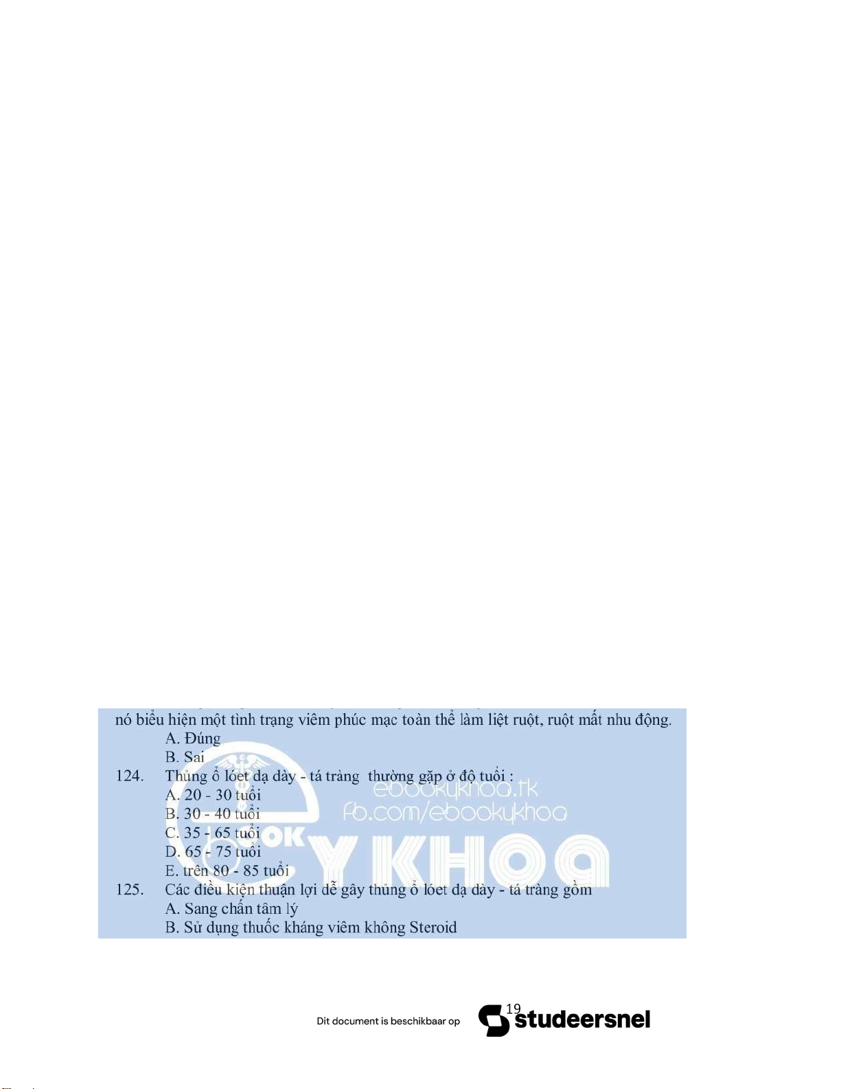 124. Thủng ổ lóet dạ dày - tá tràng thường gặp ở độ tuổi : A. 20 - 30 tuổi B. 30 - 40 tuổi C. 35 - 65 tuổi D. 65 - 75 tuổi E. trên 80 - 85 tuổi