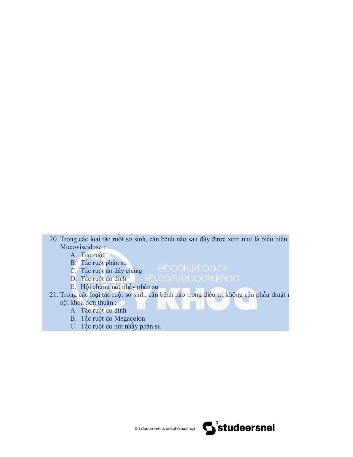 20. Trong các loại tắc ruột sơ sinh, căn bệnh nào sau đây được xem như là biểu hiện sớm của bệnh Mucoviscidose : A. Teo ruột B. Tắc ruột phân su