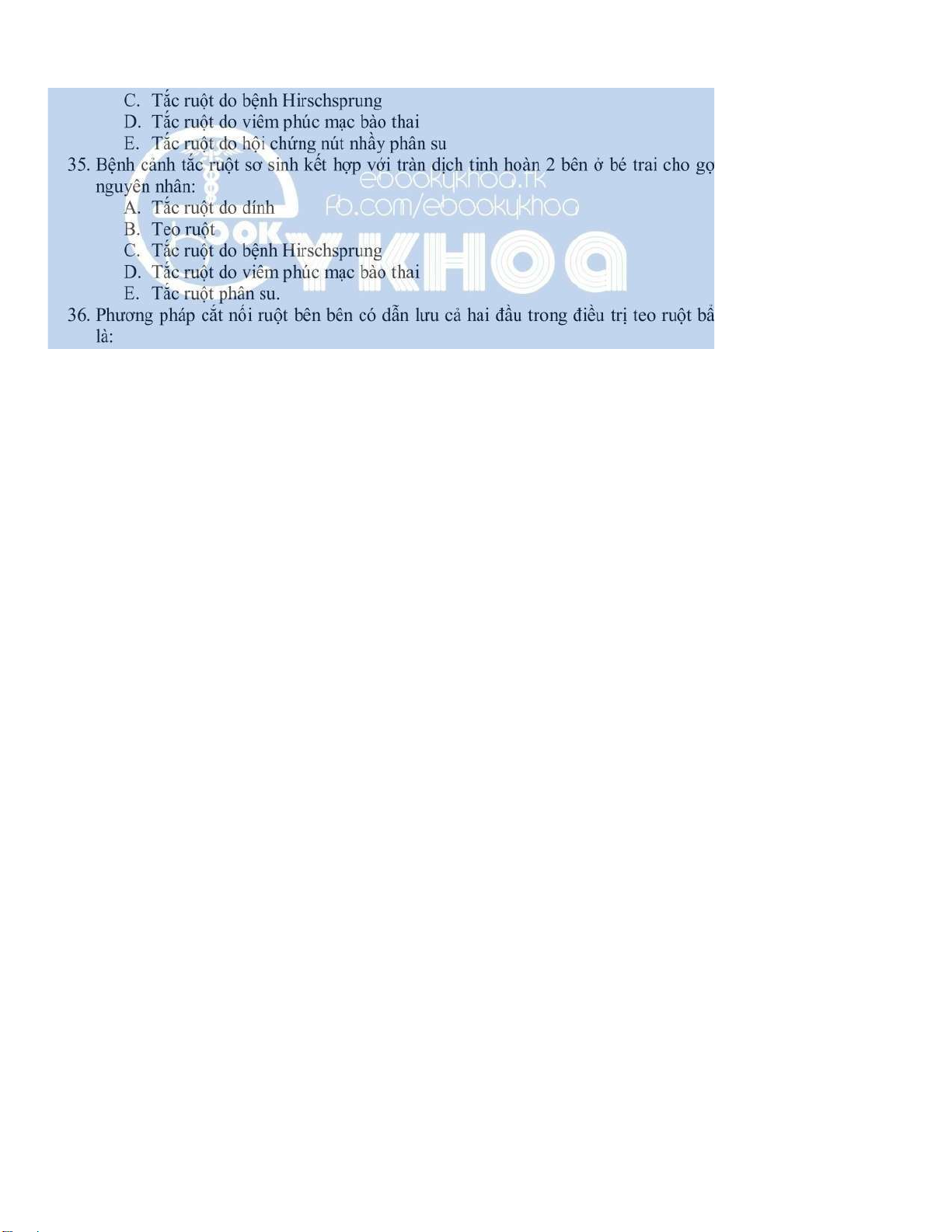 24. Trong điều trị triệt để bệnh Hirschsprung người ta thường áp dụng phẫu thuật : A. Swenson B. Bishop-koop C. Noblett D. Kiesewetter E. Rhoads