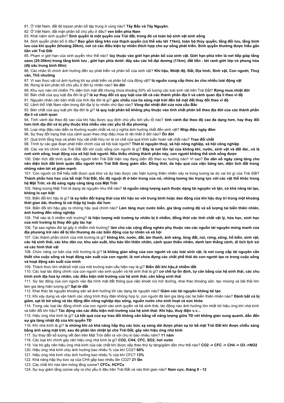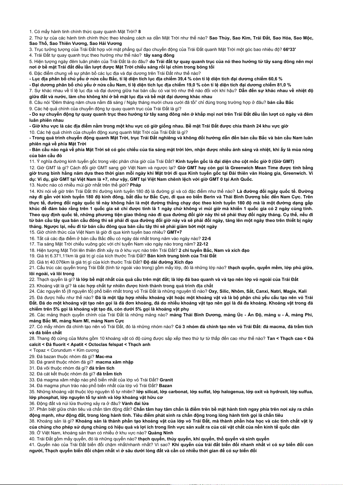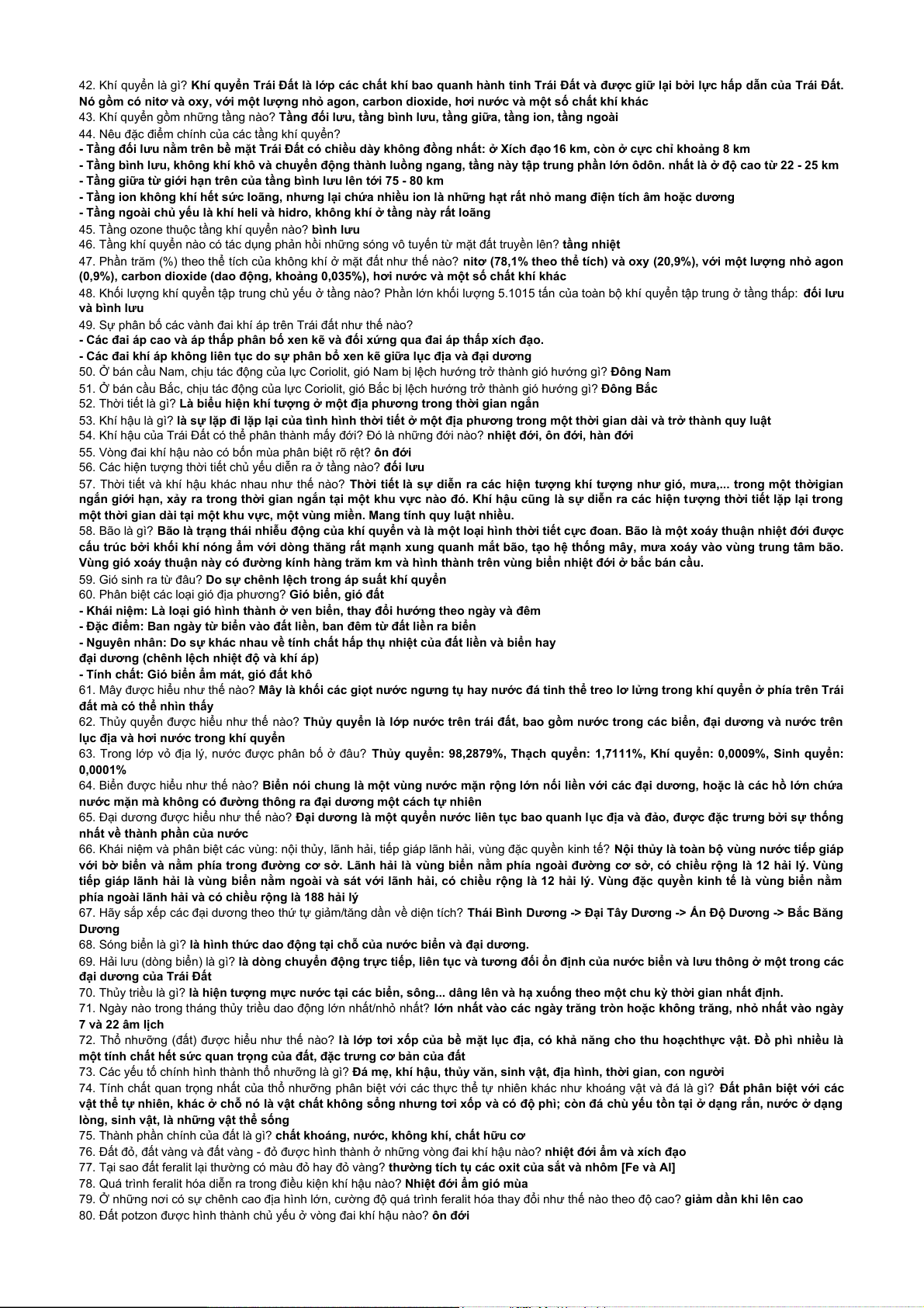 40. Trái Đất gồm mấy quyển, đó là những quyển nào? thạch quyển, thủy quyển, khí quyển, thổ quyển và sinh quyển