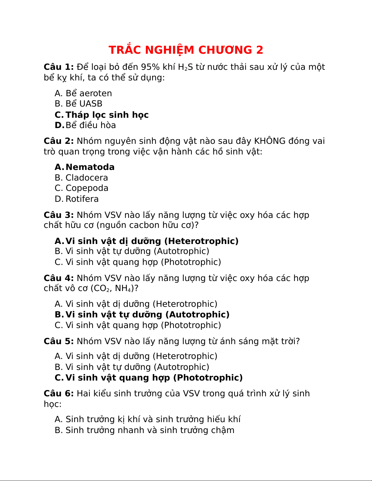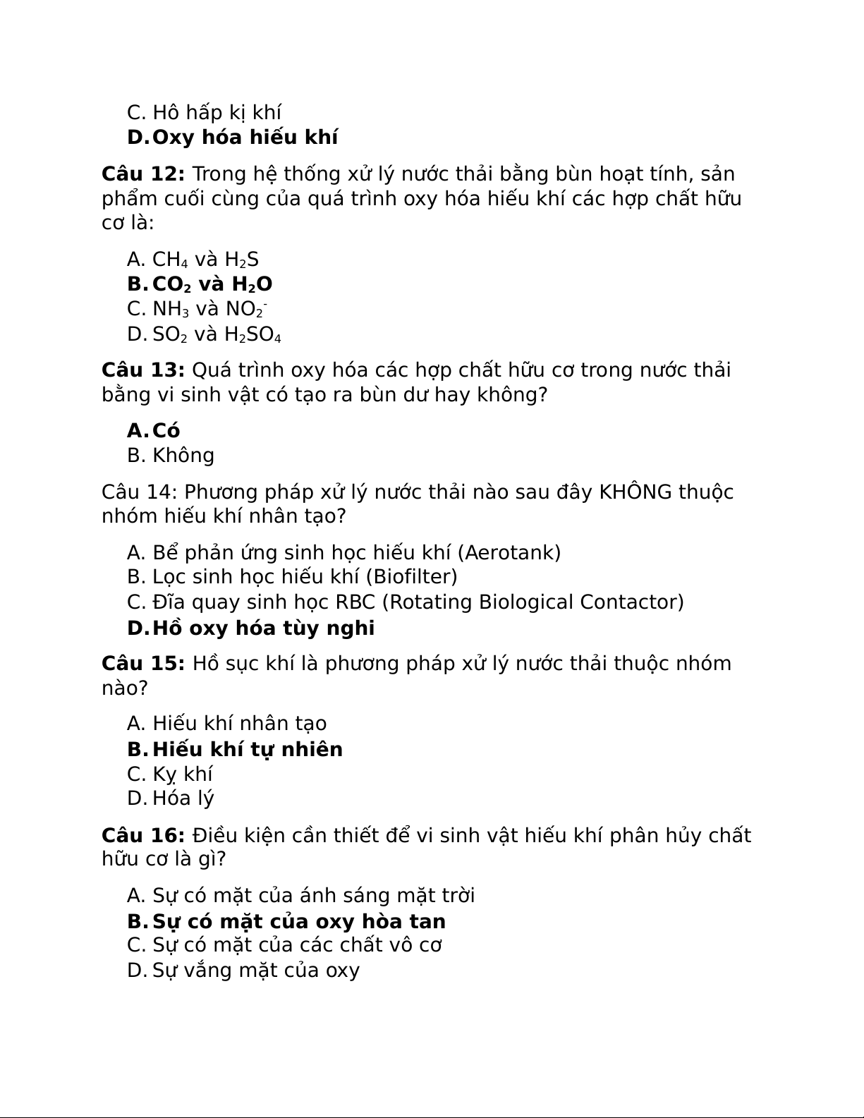 Câu 15: Hồ sục khí là phương pháp xử lý nước thải thuộc nhóm nào? A. Hiếu khí nhân tạo B. Hiếu khí tự nhiên C. Kỵ khí D. Hóa lý