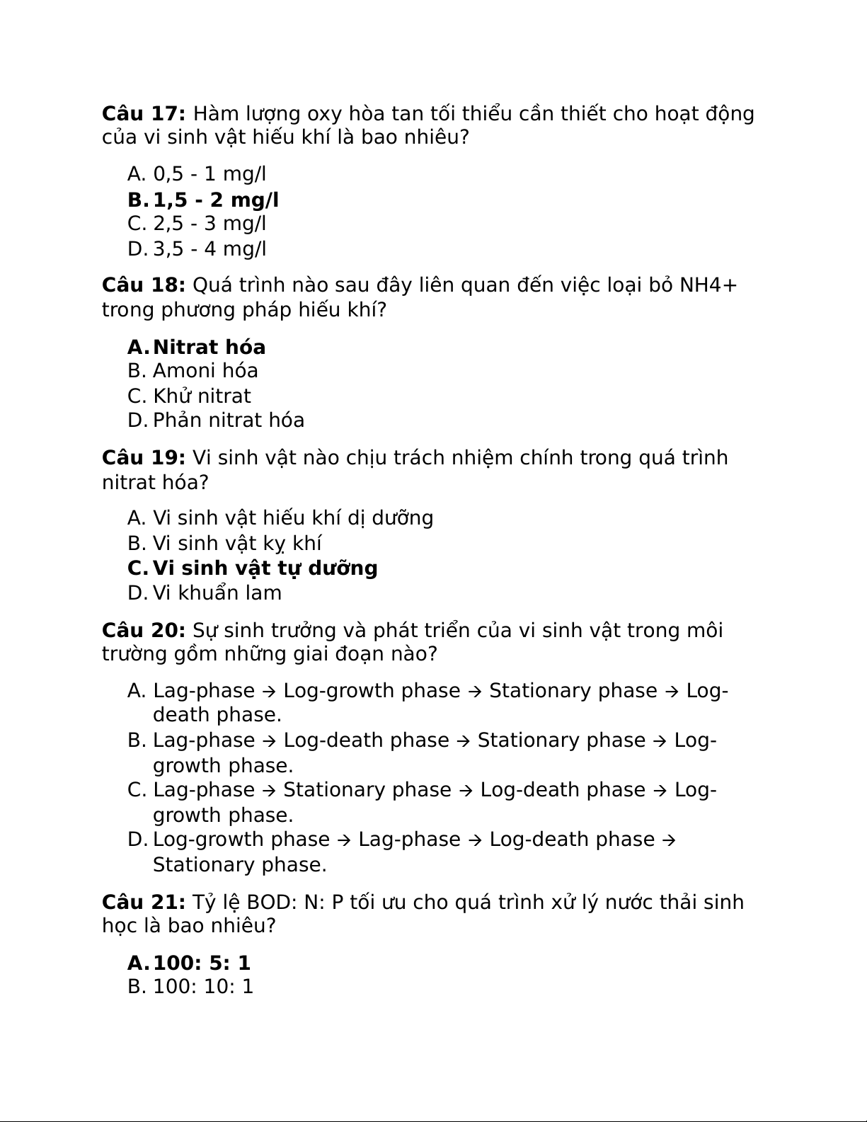 Câu 17: Hàm lượng oxy hòa tan tối thiểu cần thiết cho hoạt động