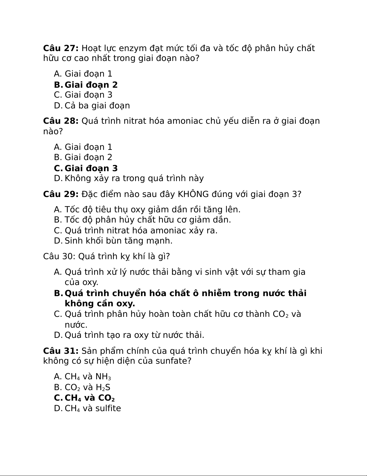Câu 25: Trong giai đoạn nào của quá trình sinh học, sinh khối bùn tăng mạnh nhất? A.Giai đoạn 1 B. Giai đoạn 2 C. Giai đoạn 3 D. Cả ba giai đoạn