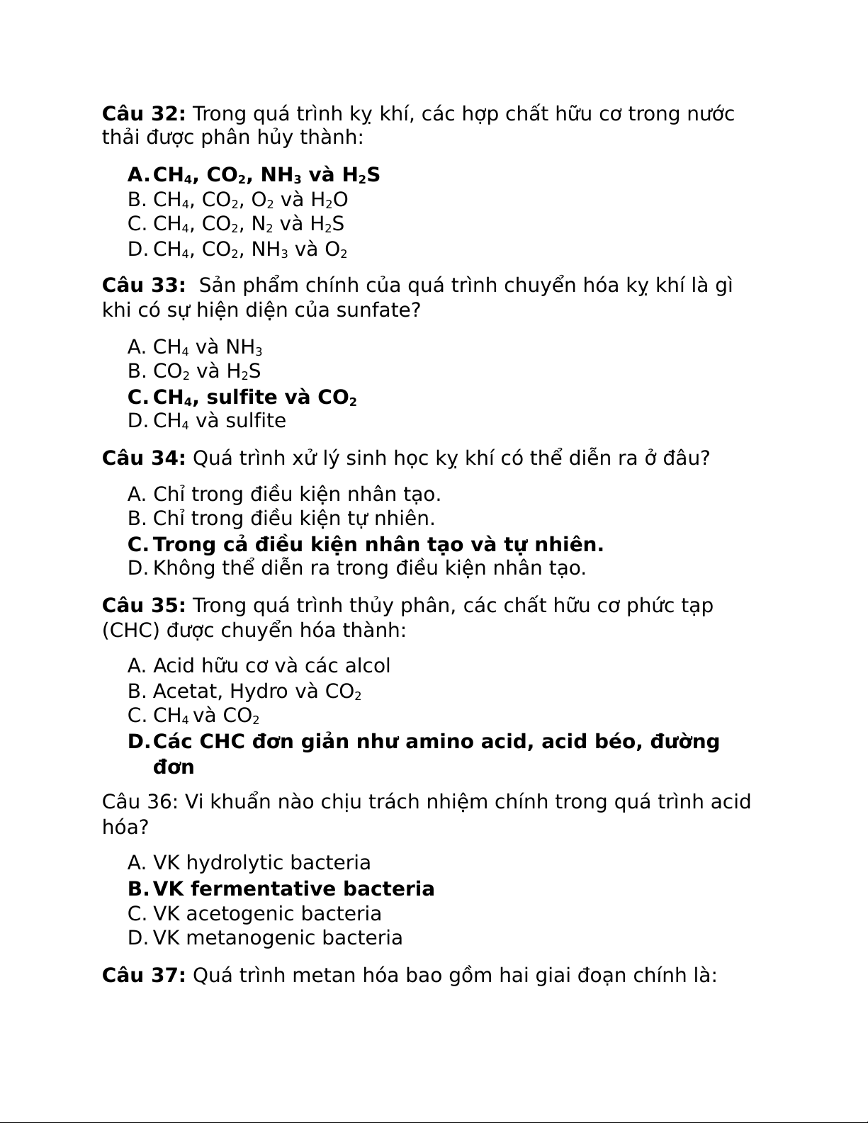 Câu 37: Quá trình metan hóa bao gồm hai giai đoạn chính là: A. Thủy phân và acid hóa B. Acid hóa và acetate hóa