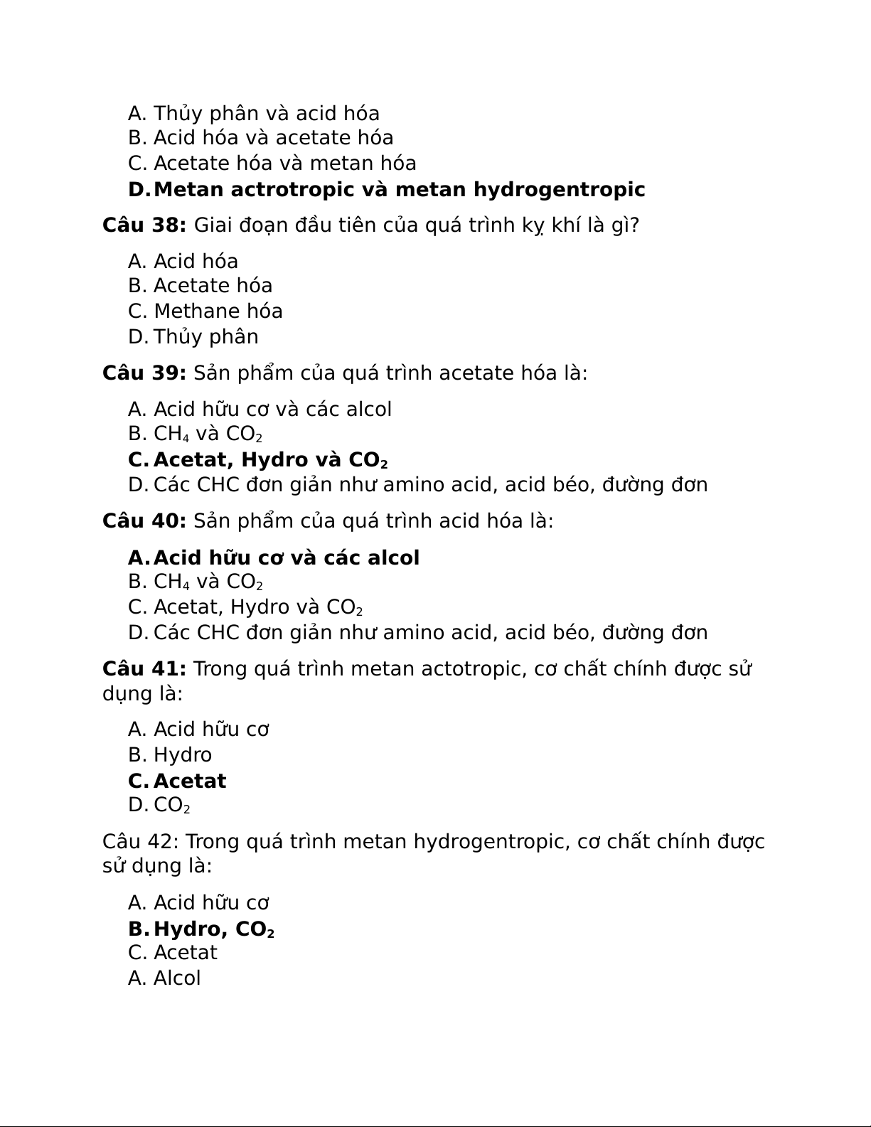 Câu 41: Trong quá trình metan actotropic, cơ chất chính được sử dụng là: A. Acid hữu cơ B. Hydro C. Acetat D. CO2