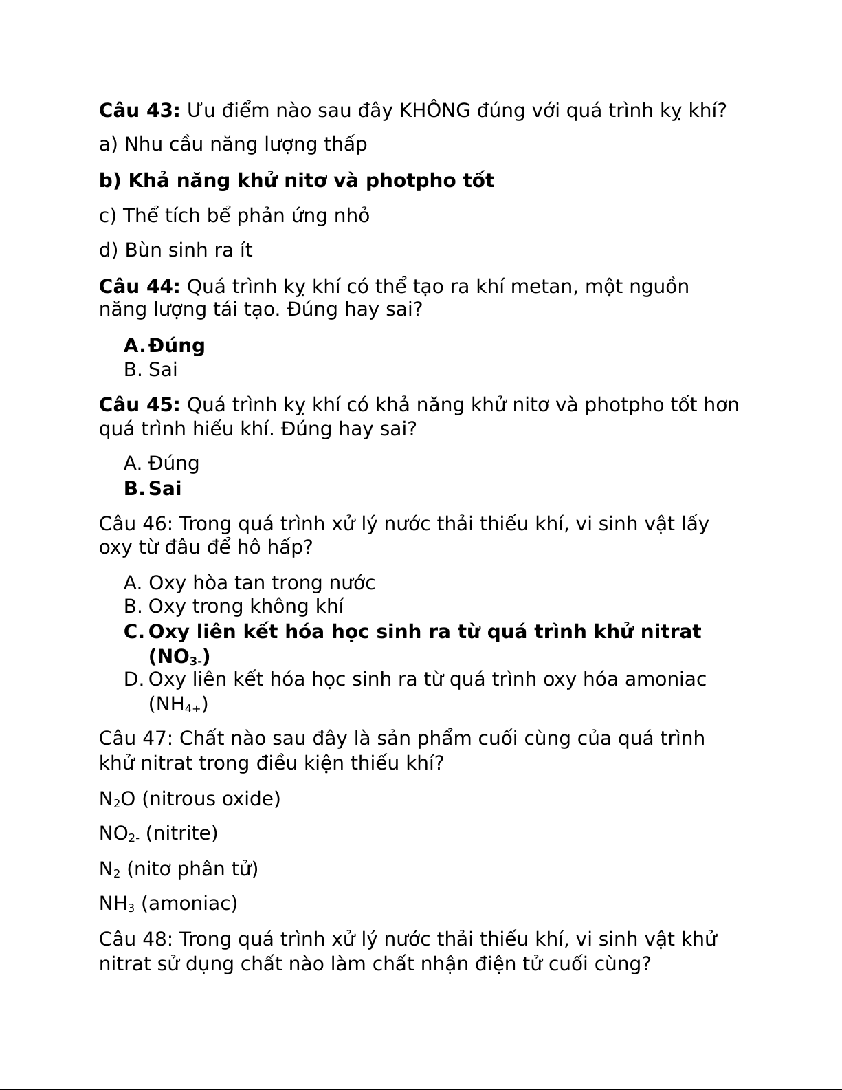 Câu 48: Trong quá trình xử lý nước thải thiếu khí, vi sinh vật khử