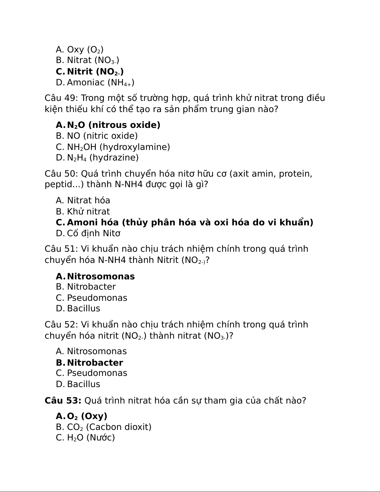 Câu 53: Quá trình nitrat hóa cần sự tham gia của chất nào? A.O2 (Oxy) B. CO2 (Cacbon dioxit) C. H2O (Nước) D. N2 (Nitơ phân tử)