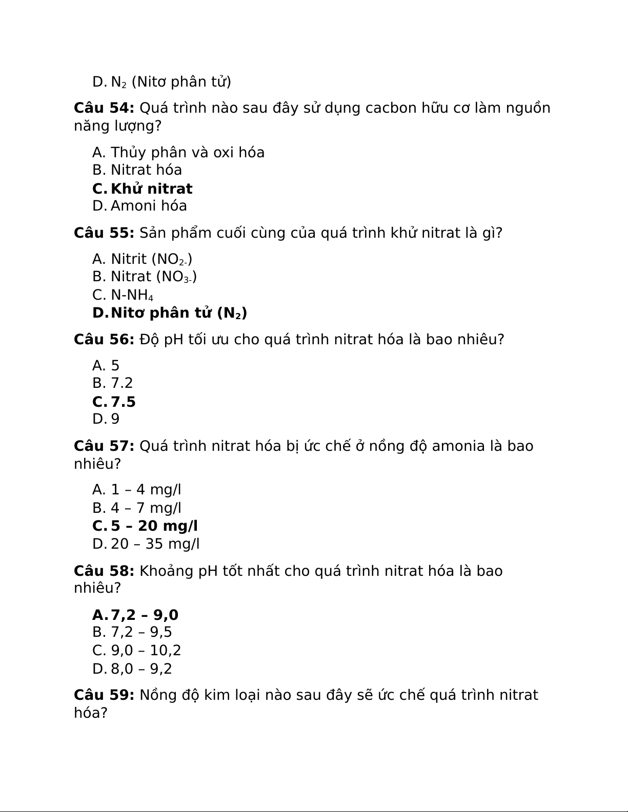 Câu 58: Khoảng pH tốt nhất cho quá trình nitrat hóa là bao nhiêu? A.7,2 – 9,0 B. 7,2 – 9,5 C. 9,0 – 10,2 D. 8,0 – 9,2
