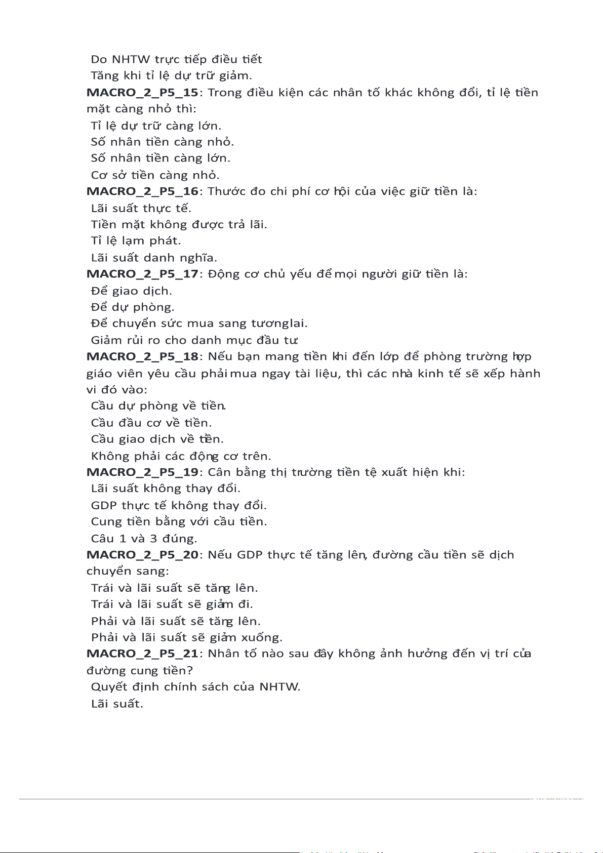 MACRO_2_P5_30: Động cơ chủ yếu để mọi người giữ tiền là: Để giao dịch. Để dự phòng. Để đầu cơ
