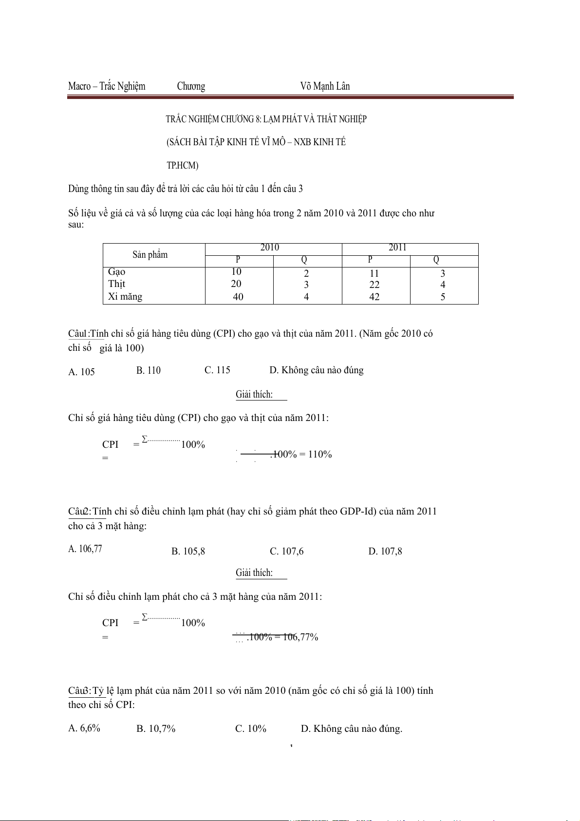 Câu 3: Tỷ lệ lạm phát của năm 2011 so với năm 2010 (năm gốc có chỉ số giá là 100) tính theo chỉ số CPI: A. 6,6% B. 10,7% C. 10% D. Không câu nào đúng. 1 Macro – Trắc Nghiệm Chương Võ Mạnh Lân Giải thích: