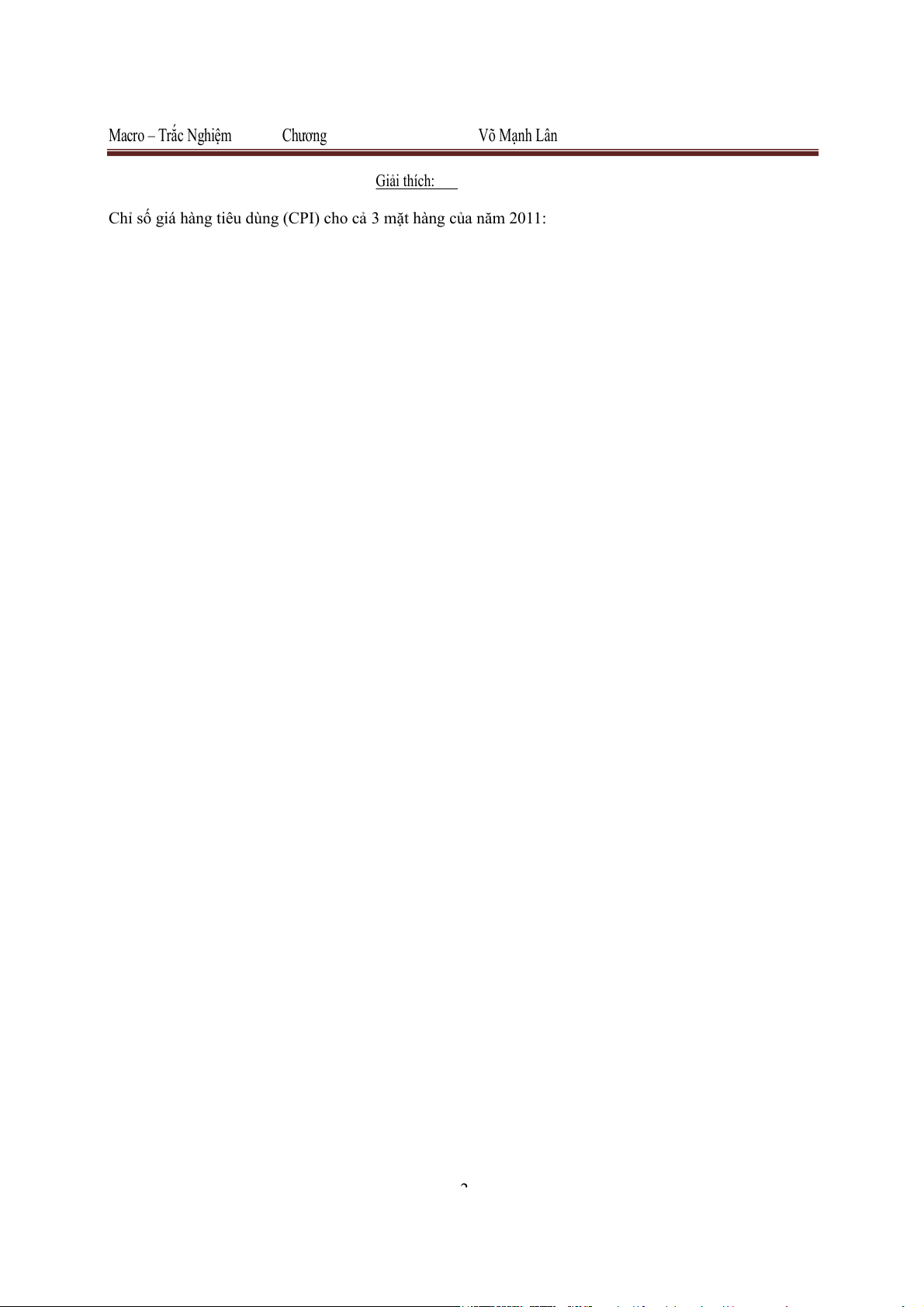 Chỉ số giá hàng tiêu dùng (CPI) cho cả 3 mặt hàng của năm 2011: 2 Macro – Trắc Nghiệm Chương Võ Mạnh Lân ∑................. CPI = 100% . . . = . . . .100% = 106,6%