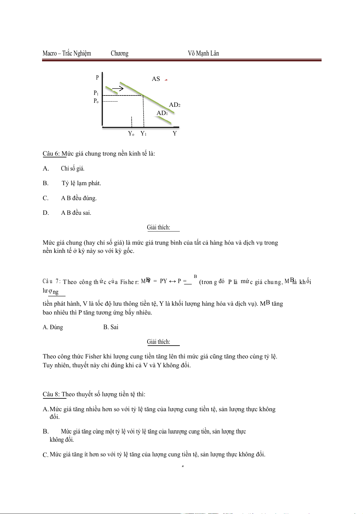 C. Mức giá tăng ít hơn so với tỷ lệ tăng của lượng cung tiền tệ, sản lượng thực không i. đổ 4 Macro – Trắc Nghiệm Chương Võ Mạnh Lân