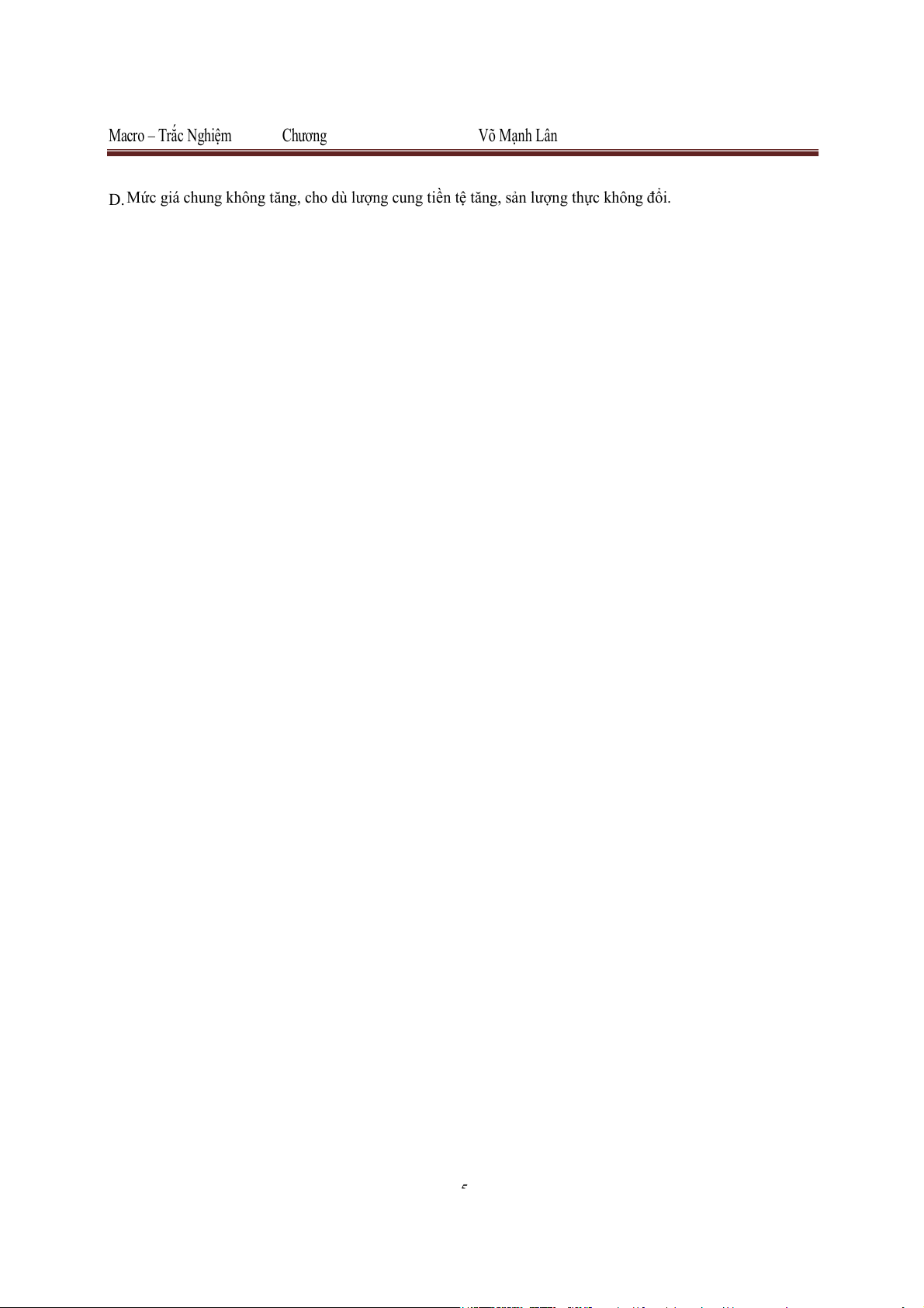 D. Mức giá chung không tăng, cho dù lượng cung tiền tệ tăng, sản lượng thực không đổi. 5 Macro – Trắc Nghiệm Chương Võ Mạnh Lân Giải thích: