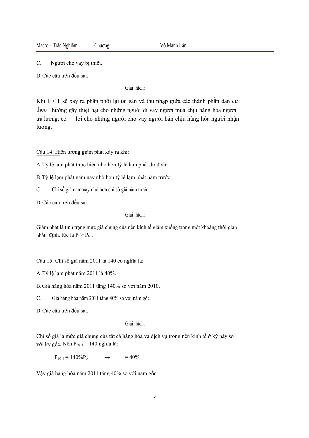 Vậy giá hàng hóa năm 2011 tăng 40% so với năm gốc. 8 Macro – Trắc Nghiệm Chương Võ Mạnh Lân