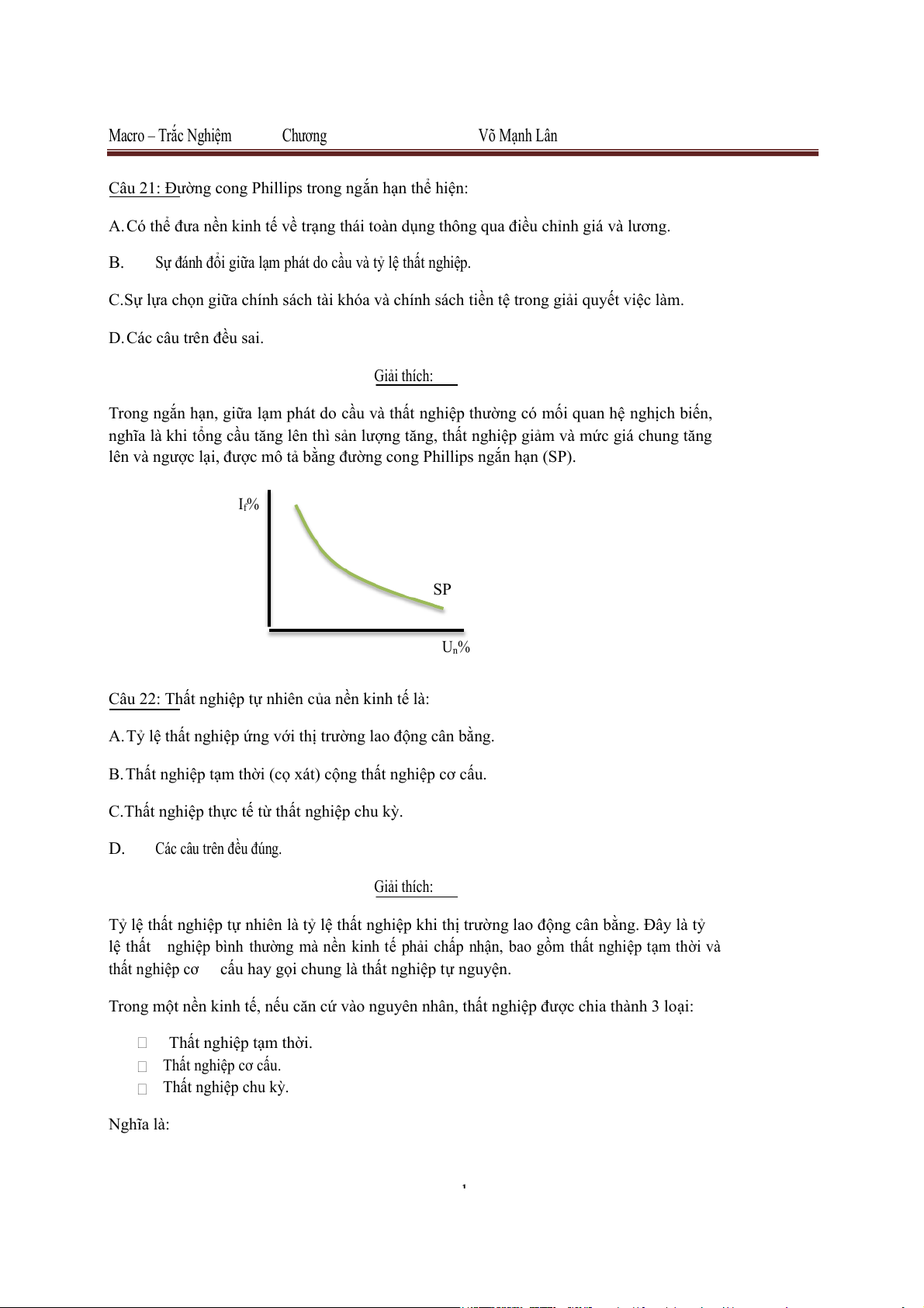 Có sự đánh đổi giũa lạm phát do cầu và thất nghiệp trong ngắn hạn, không có sự đánh đổi trong dài hạn. D. Các câu trên đều . đúng Giải thích: