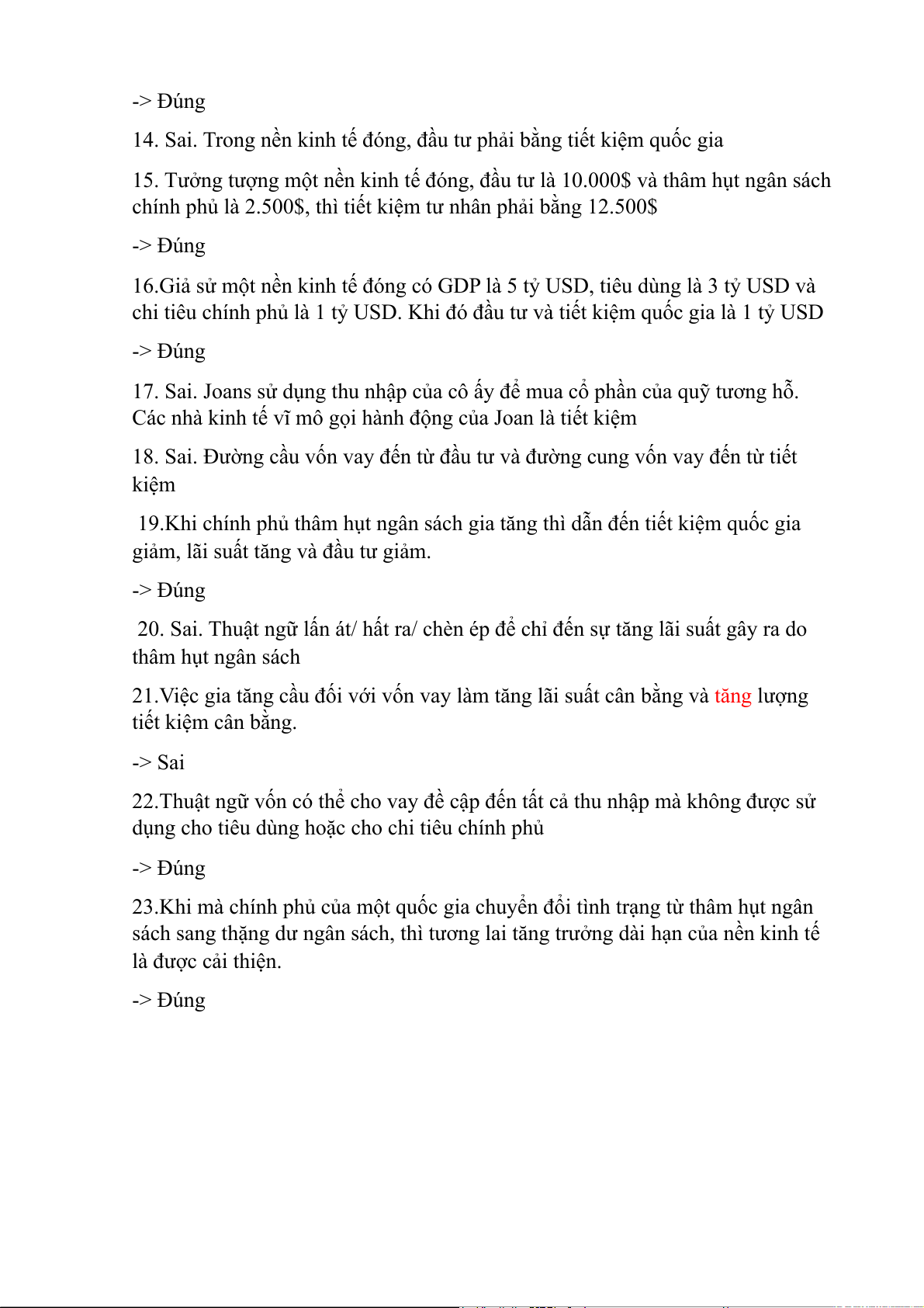 21.Việc gia tăng cầu đối với vốn vay làm tăng lãi suất cân bằng và tăng lượng tiết kiệm cân bằng. -> Sai